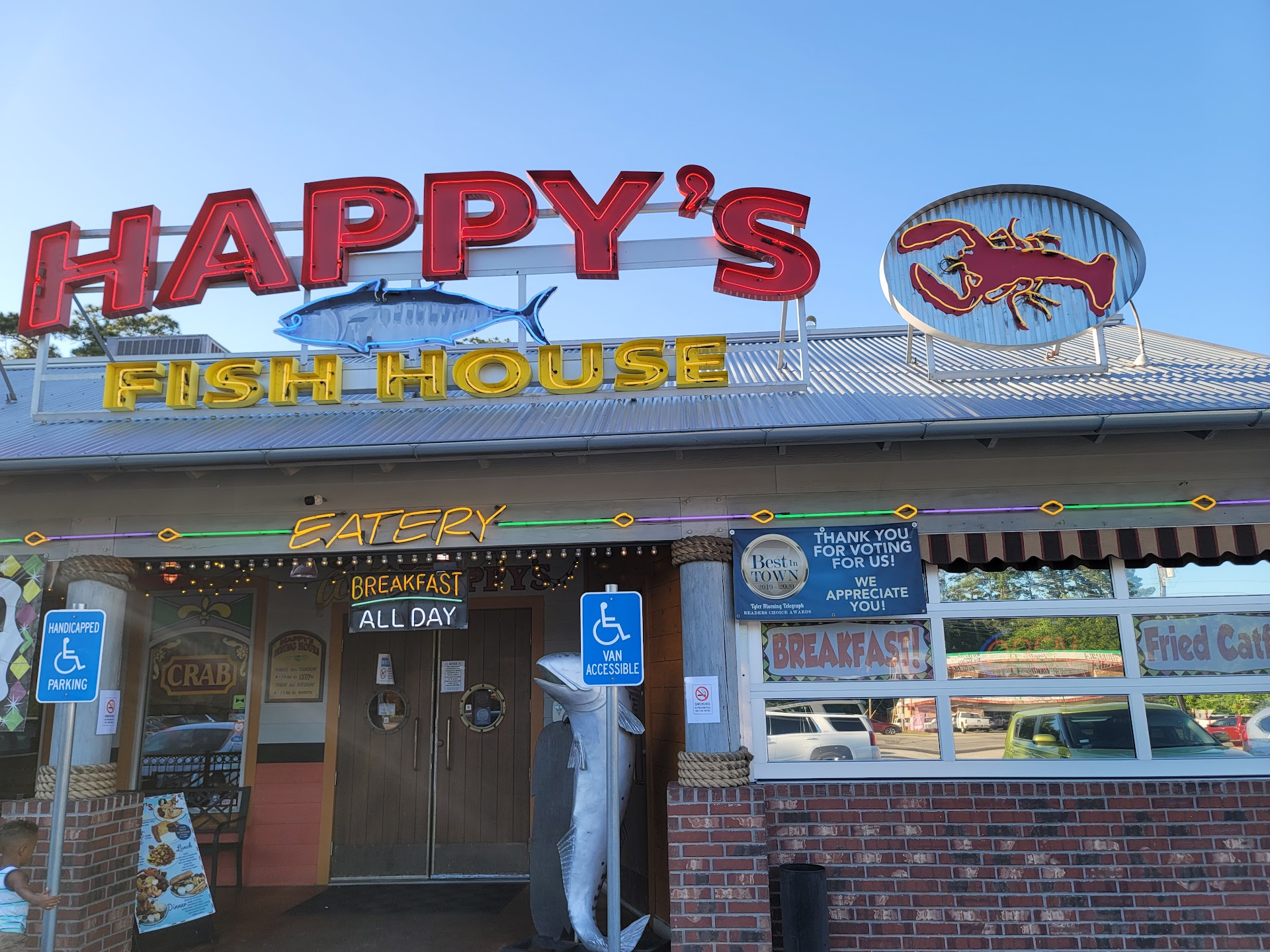 Read moreI definitely recommend Happy's to anyone & everyone! They have a menu packed full of entrees including items for those that don't like seafood & they even serve breakfast all day as well. The prices are very reasonable considering the portions are very large, in fact last time I ordered the Happy's platter & I ate on it for 3 days straight because I had so much leftover. One of the photos I'm including is my leftover bread pudding that I brought home tonight, which I HIGHLY recommend! It comes with a scoop of ice cream & is DELICIOUS!! :) It's a great place for the whole family to enjoy a meal & beverage plus dessert. This is the 2nd time I've been to Happy's & both experiences have been wonderful. They have a fun & relaxed atmosphere with lots of unique decor throughout the whole restaurant including outside. It's almost like being at the ocean without leaving home. The servers are fantastic! Our server tonight was Kierra & I'd like it noted that I give her a triple AAA kudos score for her service tonight, because she was perfect! She was very friendly, patient, funny, attentive to all of our needs throughout our entire visit & she got all of our food out (3 times; appetizer, meal & dessert) to us in a very timely & efficient manner. Happy's Fish House knocks it out of the park in my opinion & gets my five stars all...