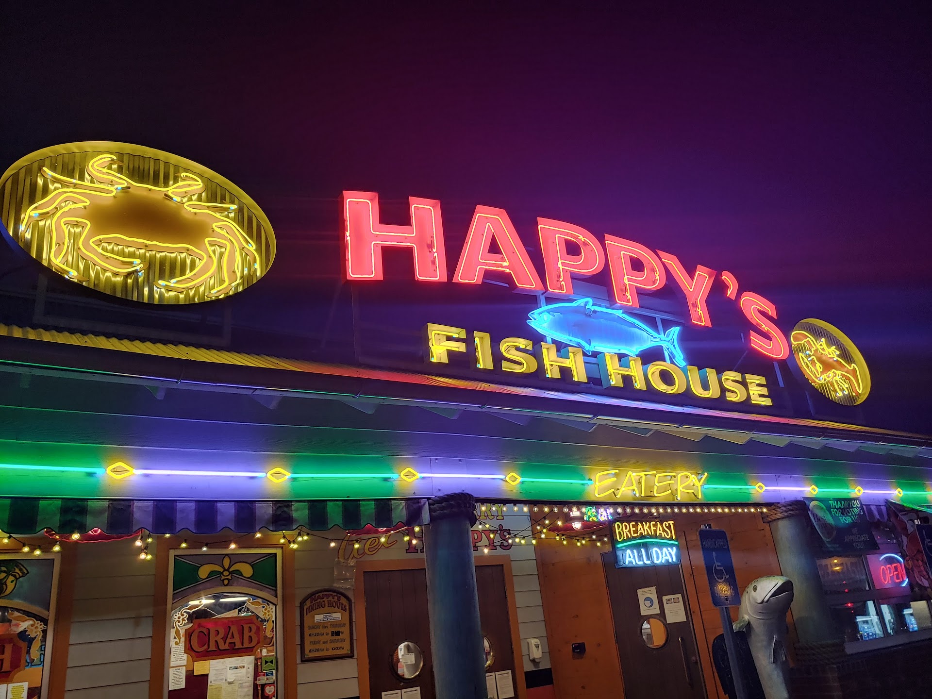 Read moreI definitely recommend Happy's to anyone & everyone! They have a menu packed full of entrees including items for those that don't like seafood & they even serve breakfast all day as well. The prices are very reasonable considering the portions are very large, in fact last time I ordered the Happy's platter & I ate on it for 3 days straight because I had so much leftover. One of the photos I'm including is my leftover bread pudding that I brought home tonight, which I HIGHLY recommend! It comes with a scoop of ice cream & is DELICIOUS!! :) It's a great place for the whole family to enjoy a meal & beverage plus dessert. This is the 2nd time I've been to Happy's & both experiences have been wonderful. They have a fun & relaxed atmosphere with lots of unique decor throughout the whole restaurant including outside. It's almost like being at the ocean without leaving home. The servers are fantastic! Our server tonight was Kierra & I'd like it noted that I give her a triple AAA kudos score for her service tonight, because she was perfect! She was very friendly, patient, funny, attentive to all of our needs throughout our entire visit & she got all of our food out (3 times; appetizer, meal & dessert) to us in a very timely & efficient manner. Happy's Fish House knocks it out of the park in my opinion & gets my five stars all...