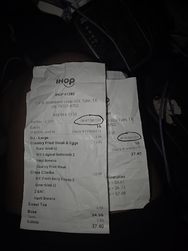 Read moreWe ate at our usual IHOP in Tyler, TX after a medical procedure. It was at 5:00pm so we were one of 2 customers in the restaurant. Not busy at all on a Friday afternoon. I ordered off the menu - "power pancakes, scrambled egg whites, plant based sausage, and fruit." Just like the menu offered. My husband ordered a Denver omelet without bell pepper. The waitresses didn't seem to know what I was talking about regarding my order so I showed her on the menu. She left. Returned 5 minutes later and made sure I understood that it was "egg whites" on the order. Yep. At least 30 minutes later the place is beginning to fill up and the new customers are getting their food. 45 minutes later we try to catch her and ask her again and again where our order is. She pretends not to hear us until we practically shout at her. Meanwhile I can hear the cook and some of the wait staff talking about my order. "What are power pancakes?" "What is the plant based sausage?" Finally she brings our food with the explanation that "he never made that before." Oh, no. She put the plates down in front of us. My plate had 2 burnt circles of sausage, a revolting oily, worm pile looking thing that was the egg white scramble, and some random pieces of fruit scattered across the center of the warm greasy surface. (Usually, and in the photo, the "seasonal fruit" is in a small bowl.) The "power pancakes" which seemed to give them all such a turn, would have been good had they not been slightly hard and burned on the surface and cold. My husband's Denver omelet was odd in that the cook tossed chopped up overcooked sausage links and what appeared to be burned chopped up roast on top. All in all my restaurant karma is still with me....