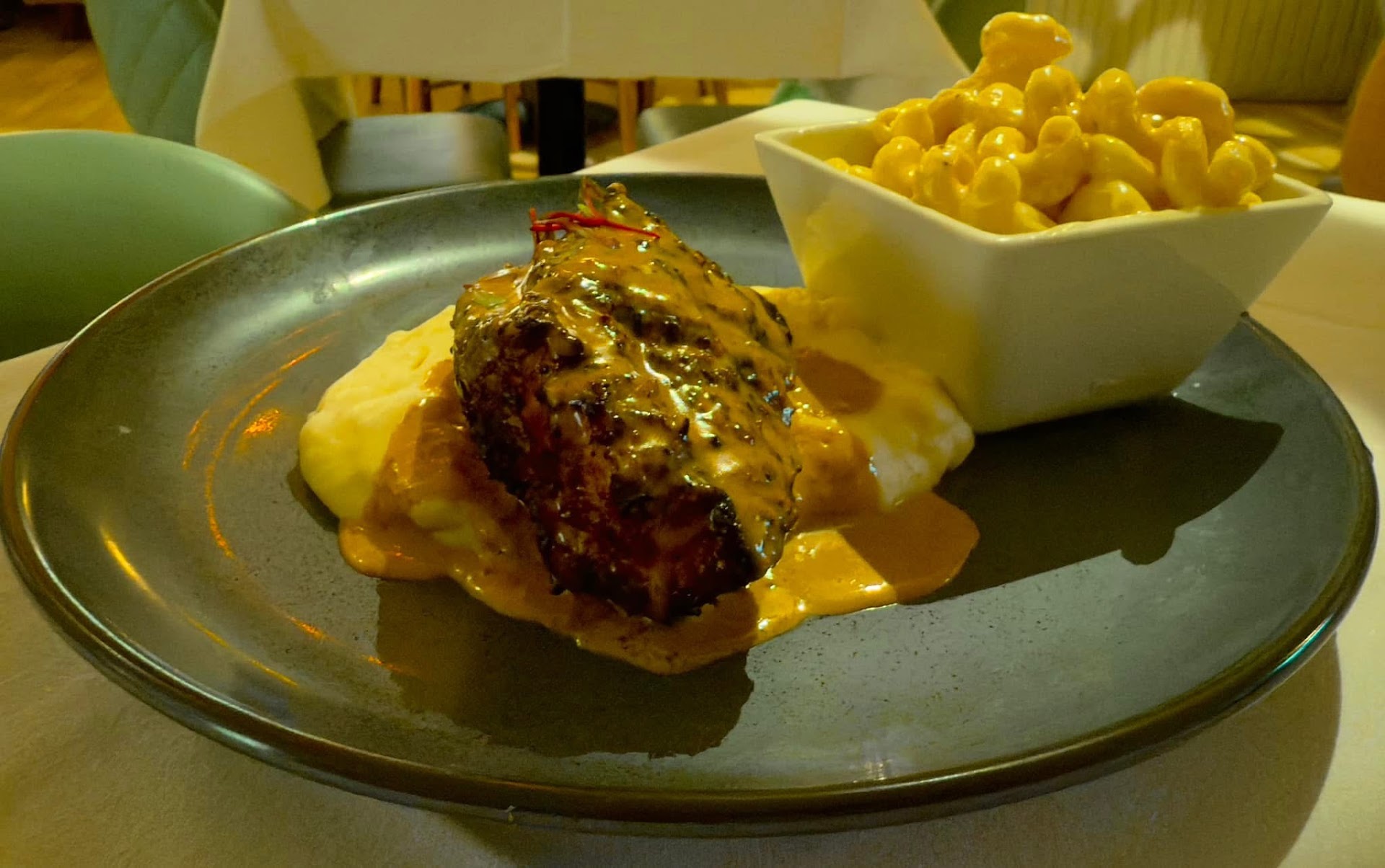 Shortly after, our entrees arrived. I jumped right into the mac & cheese first. I was somewhat relieved when I realized how good it was. I guess I’ve been let down on some mac & cheese lately, so my hopes weren’t very high. It was creamy and full of flavor and it honestly didn’t need any extra salt and pepper in my opinion. I then took a bite of the pork chop. It was a thicker cut and heavily seasoned, but not in a bad way. It was very tender and juicy all the way through and it paired so nicely with the peppercorn sauce. Add a bite of mashed potatoes to the mix and I was a happy man.