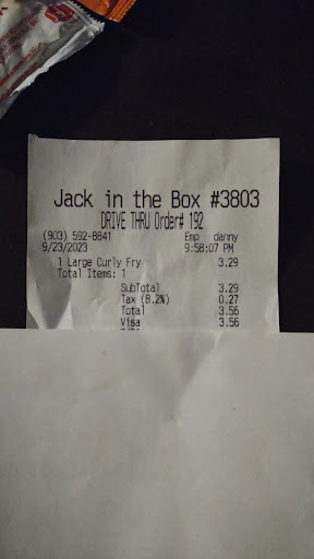 Read moreI went to Jack in the box after work with my girlfriend to treat both of us after a long day. We had a simple order in mind as we both enjoy getting to share, but also eating our favorite foods from what used to be our favorite spot. I ask for a #7 combo with large curly fries, and a Dr. Pepper to share since my girlfriend orders loaded tiny tacos, and curly fries. We were asked to pull around and wait in space 1 for our food. It arrived and we received the #7, large curly fry, large Dr. Pepper, and loaded tiny tacos. Although upon further inspection of our receipt, we noticed we were charged for a large coke, and not a second large curly fry. We go back to sort out the miscommunication and when we get back to the window, the woman at the register proceeds to tell us we shouldn't have asked for a large coke if we wanted a large fry. The least she could have done is understood we didn't even receive the second fry we actually asked for, and didn't receive the drink we were charged for. Instead we were just told that we were wrong and charged separately for a large fry... I'm still waiting for the refund on my card for the drink we never asked for but told we were. I don't understand the disrespect my girlfriend received for trying to clear up a simple misunderstanding. Unacceptably rude for food service, and ruined my hope for any decent fast food everywhere. Thank you Jack in the box. The food was cold after we got home since we had to wait while we were being told what we ordered instead of just getting we asked for...