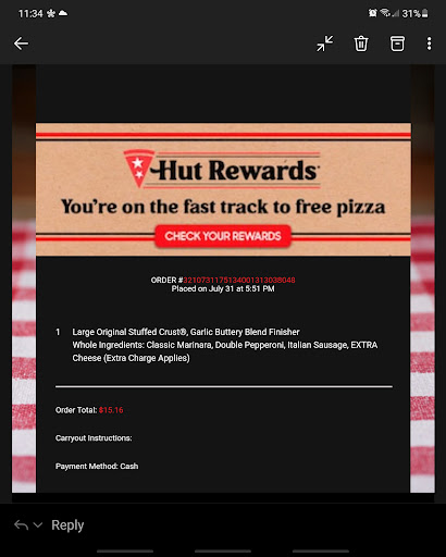 I have had only ONE bad experience with this particular store however. On 10/11/19 at approximately 220 pm, I missed a couple of calls from the delivery driver bringing our order. (I simply didn't have my phone on me). When I checked my phone I had a received a text from the same unknown number that read (and I quote) "I am skipping you...this is PH". I have worked for a PH owned by the same franchise as this store and I am aware of the protocol for a situation as this. The driver should have called the store & explained to the mgr that he was unable to contact me. In which case the store would have attempted to call me. THEN, if unsuccessful to contact me, the driver should bring my order back to the store. The driver did not follow protocol in this situation. AND I KNOW for a fact...you are to NEVER tell a customer your are "skipping them". That was incredibly rude! And very much unappreciated.