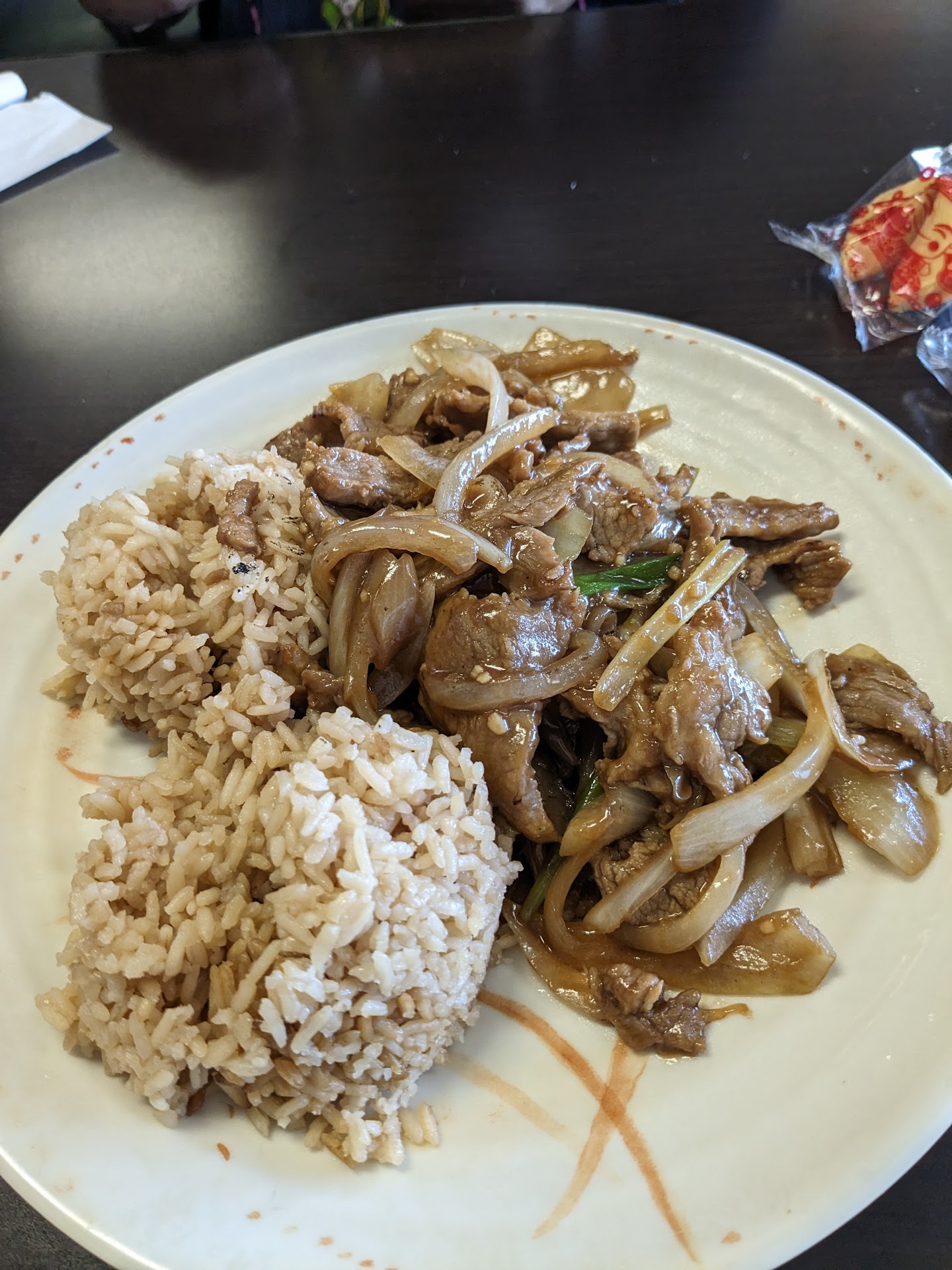 Mongolian beef. This is what I ordered and sadly it was not that good. Mongolian beef is supposed to be spicy and this dish had absolutely no spice even though I did ask them to make sure it was spicy. For some reason here in East Texas Chinese restaurants seem to make their Mongolian beef sweet. In all my years traveling I've never had sweet Mongolian beef anywhere but in East Texas. So back to this restaurants Mongolia beef it was lacking in flavor and spice. One positive the beef was tender. Came with a side of what I assumed was fried rice. It definitely wasn't just plain white rice. It had a slight brown color to it and not much flavor. If this is a version of fried rice then they need to find any recipe.