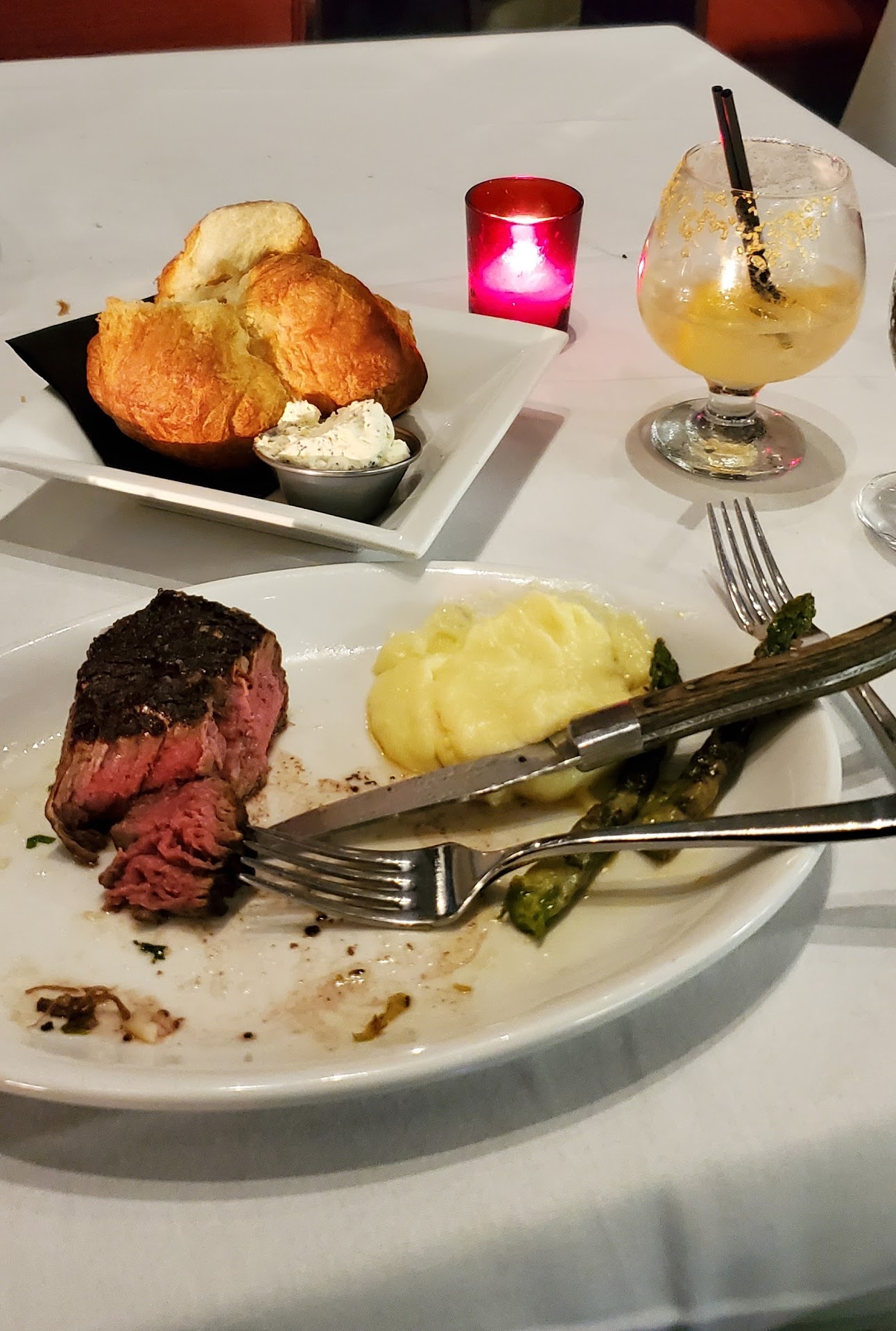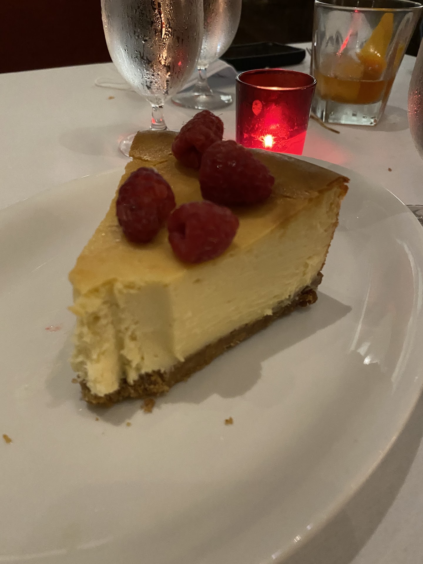 Now for the steaks. My husband and I both got filets. He ordered his medium rare and it was cooked a bit over for medium rare, but fine. I ordered mine medium, and it was perfectly cooked. Unfortunately it was lacking was in flavor. My husband said the filet he got the previous week at Montez Creekside was much more flavorful than the one he got at Prime. Which is very disappointing for the price, and considering Prime 102 is a steakhouse! The sides: mushrooms were delicious; asparagus was over cooked and there were about 6-7 little pieces for $14. The complementary cake and ice cream they gave my husband for his birthday were delicious. We also got the cheesecake, and it was pretty dense and just okay. Half of it is still sitting in our fridge, and normally a good piece of cheesecake wouldn’t last a day in our house! :)
