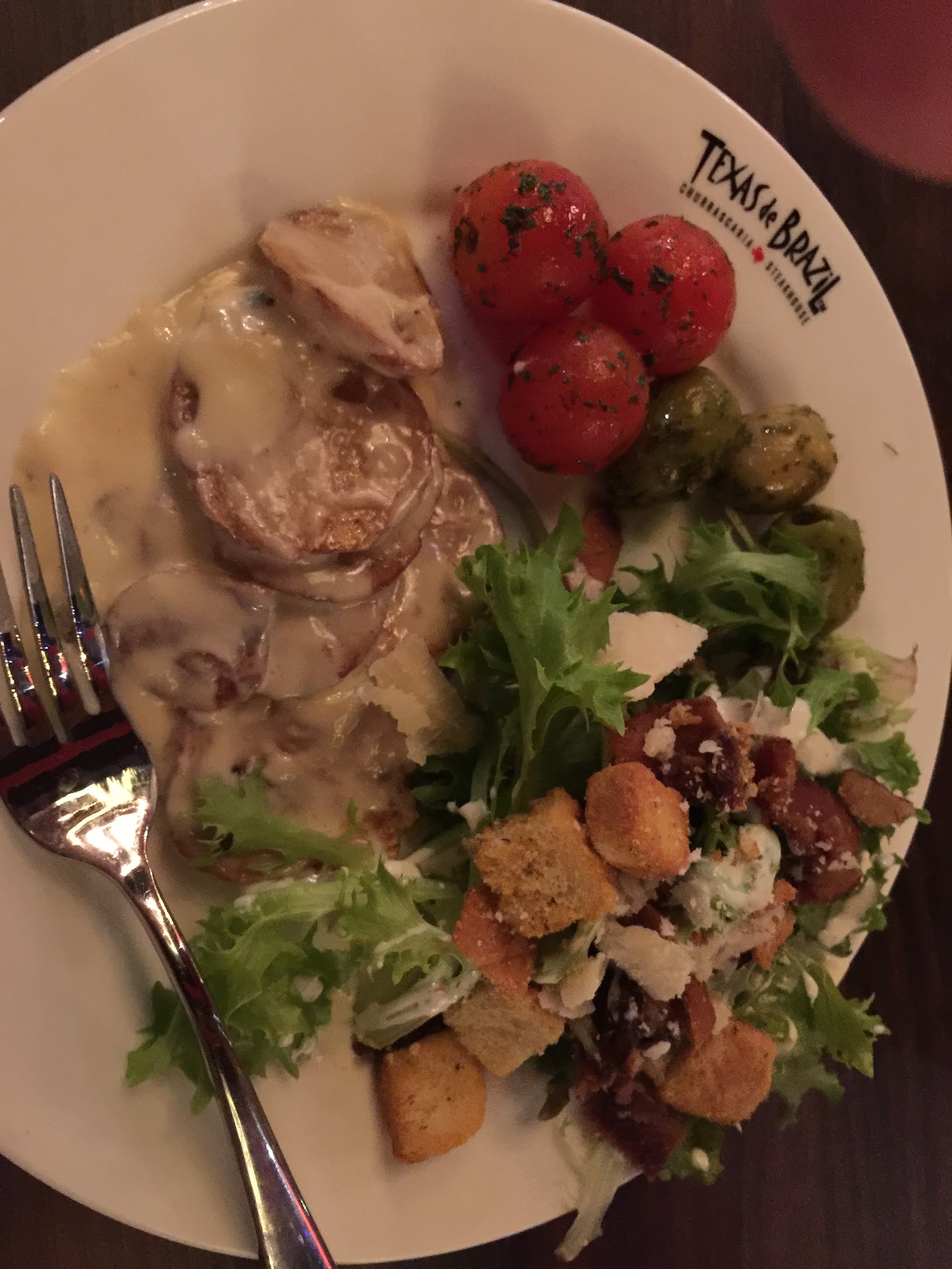 The salad bar or what ever you can call it is the smallest selection I have ever seen at a Brazilian restaurant. Here is what a 50 dollar meal gets in Tyler. Potato's, rice, gravy, California roll (cheap kind) some tomatoes and olives, big block of parmigiana cheese to put on what not sure as the rest left at the bar is cabbage croutons and ranch. Some cold shrimp or fish might be there if it is not an empty bowl.