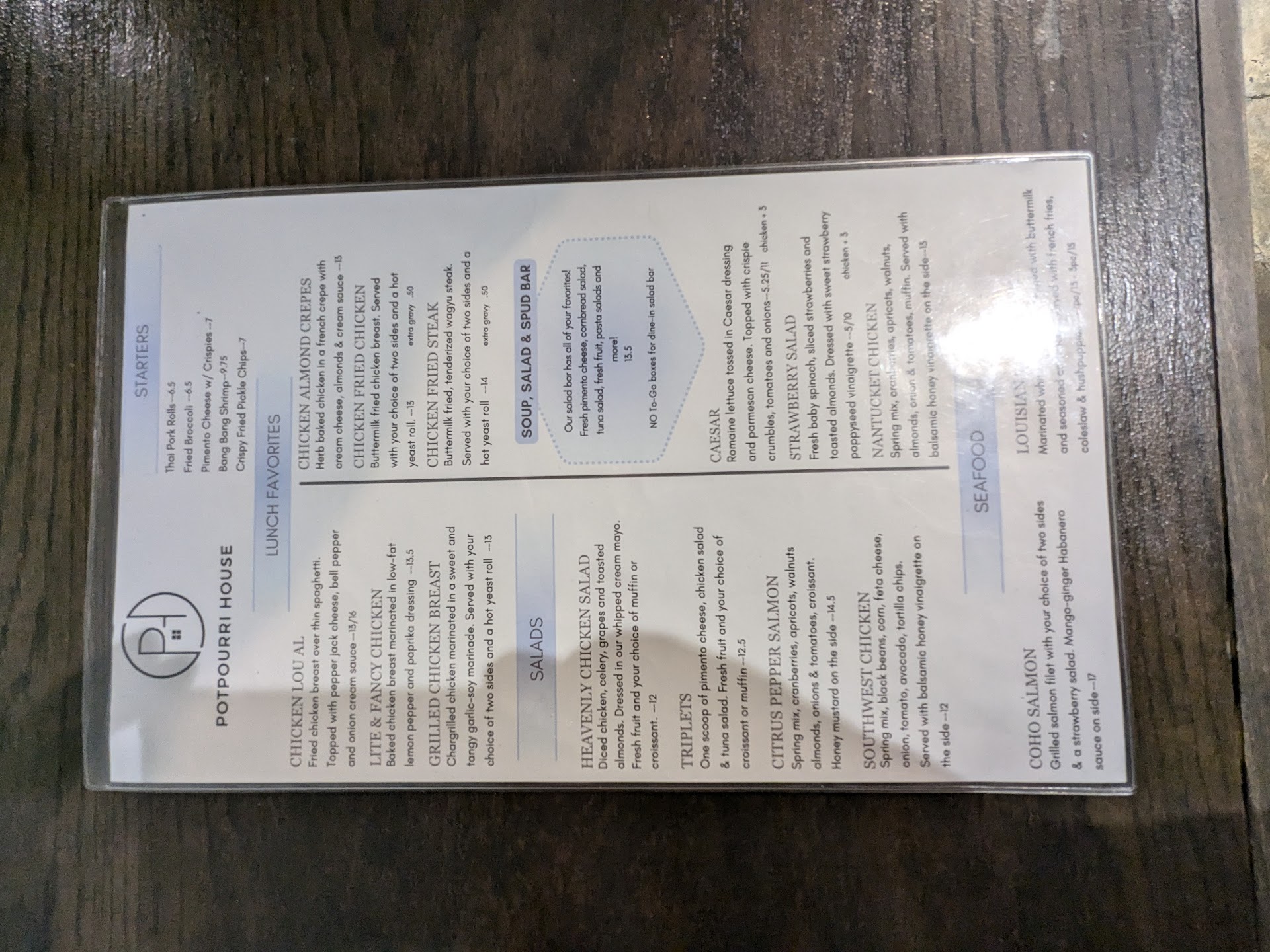 Read moreIn the past 2 years, I have been supportive of the Potpourri House - encouraging friends to come for lunch after bowling. Today’s really bad experience now makes me hesitant to recommend lunch there again. We waited over 45 minutes to have our orders taken - friends at the table that selected salad bar just went ahead and got their orders and were 1/2 finished with eating by the time our order was taken. When we asked repeatedly about status of our meals … they finally brought it out - wrong orders - which we accepted out of desperation. The soups were bad, they brought wrong beverages, and the salads were incorrect. Then we waited another +45 minutes for the tickets… one lady’s ticket was missing … so the waitress comped it. Others were randomly billed for the original price or discounted prices - instead of the waitress apologizing over and over, the manager should have stepped in to comp all meals. When I got to my car and thought about what had just happened, I called in to speak to the manager. I explained that I was calling to ensure management was aware and had the opportunity to correct their service issues. Wes came to the phone, and apologized saying that he was “unaware” of what had occurred and would address it immediately with staff. After hearing this “response” I decided to write a review. The fact is that the manager was there on the floor and was grossly negligent it he did not see what we were going thru seated at the table by the entry. In fact all of the waiters were openly discussing the situation as were sat there stranded until our credit cards were finally returned. So disappointed with the service, food and lack of...