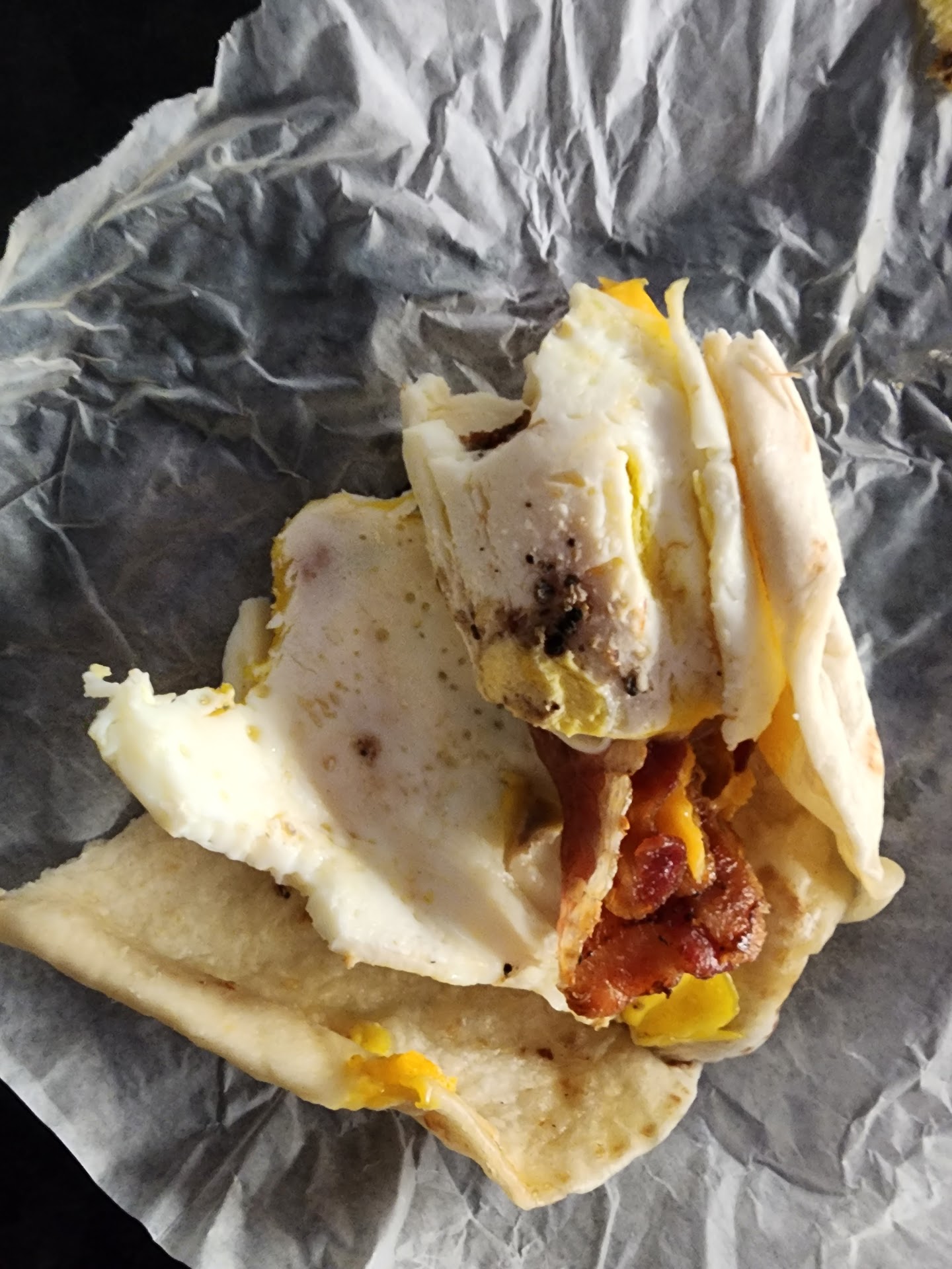 Read moreNot very good. The eggs are always overcooked with way too much pepper. The breakfast items are so greasy that they drip with grease so it ends up in the trashcan. Also, the worst bacon, egg, and cheese biscuit I've ever had. Biscuits are hard and cold. The crossaints are decent, but the eggs still have too much pepper. Taste only like pepper. Maybe just stick to a glazed donut. The photo is mostly egg, not tortilla. You can see a little bit of the tortilla. All that black stuff is pepper. They should call it the pepper taco...