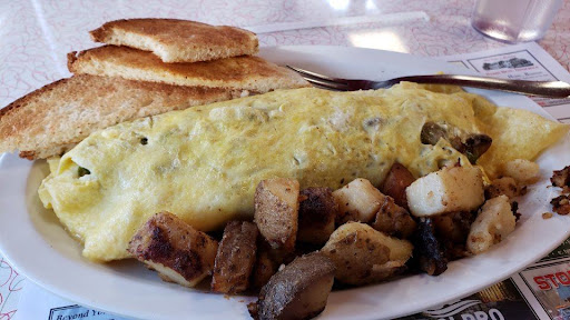 At the Dream Diner, I ordered their Brill omelette (shaved steak, mushrooms, pepper, onion, and swiss cheese... side of home fries and sourdough toast.)