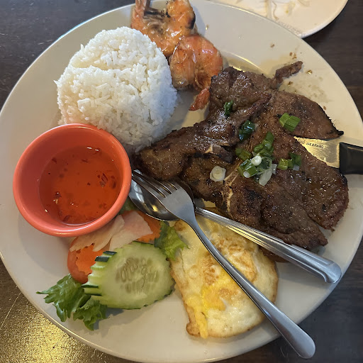 Meat portions are hearty, noodles tender, and while the broth leans lighter in depth, it is easily brightened with hoisin or chili. Spring rolls are tightly wrapped and fresh, served with a balanced peanut sauce, while the grilled pork chop and shrimp rice plate shines with smoky char and sweet-savory seasoning. Portions are ample, plating is straightforward, and freshness is consistent across dishes.
