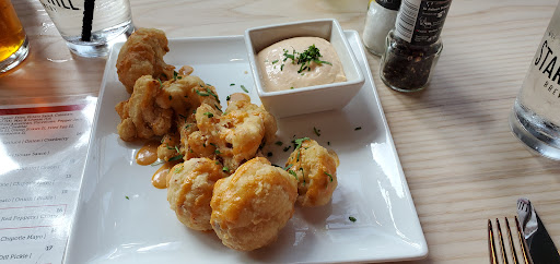 First of all, some housekeeping. There are two places here - the Starr Hill Brewpub, which you are reading about. That is indoors and air conditioned. There is also the Starr Hill Biergarten on the rooftop. The Biergarten has a more limited menu, but has live music and stuff. But we won't talk about that because this isn't a Google Page of that and I wasn't there. I was indoors.