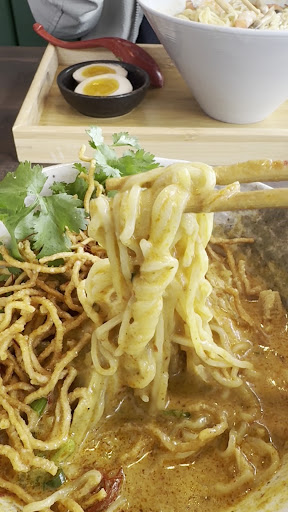 The Tom yum ramen had overcooked but edible shrimp which were a nice size but lacked flavor. The broth was sickeningly sweet and nothing like a Tom Yum soup you'd get from an authentic Thai restaurant, no sourness to the broth at all. the noodles were alright but seemed as though they weren't fresh. Really disappointed as I was really looking forward to trying a new place. The vibe is nice but the food is awful.
