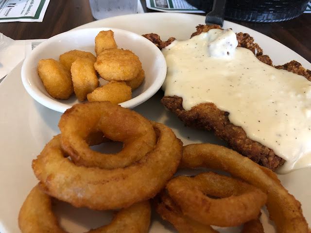 So my wife won a contest, and one of the things she received was a dinner for two at the Buttersburg Inn. We live on Fort Detrick, so it was about a 30 minute drive to get there, but the roads were fun and I enjoyed the drive a lot! Once we arrived we were greeted by the owner (Jim) and he got us a table. This place is a CLASSIC small town restaurant, and I freaking loved it. The locals are there... kisses and hugs are exchanged... it was great. Anyway, I ordered the stuffed pork chop with mac-n-cheese, green beans and apple fritters (they were extra, but who cares). My wife ordered the chicken fried steak with mashed potatoes and green beans. The pork chop was HUGE! The stuffing was very flavorful and the meat was not only from a local butcher, but perfectly cooked... fell right off the bone. The macaroni was the 2nd best I have ever had (and that is some serious praise coming from me) and the beans were good too. My wife's steak was very tasty with perfect breading, but I thought it was just a tiny bit thin. I really did not care that much though because it tasted great and the gravy was amazing! We had carrot cake and coconut cake for dessert, and that sealed the deal... I...