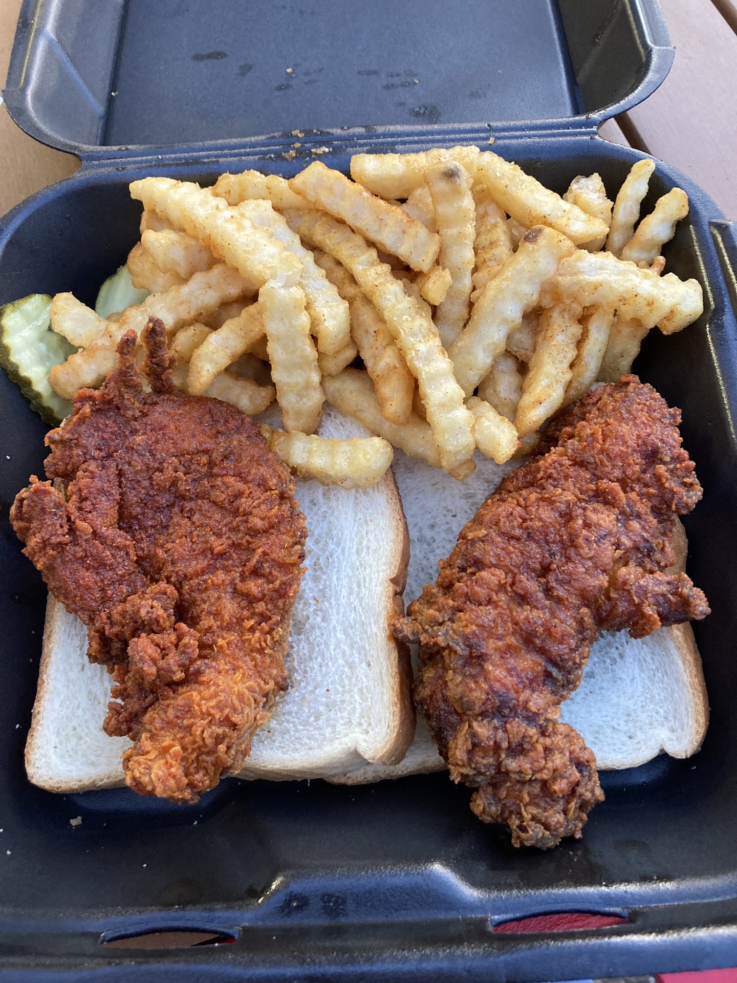 Our order consisted of a #3 (1 tender and 1 slider with fries); 1 tender which was accompanied with a slice of bread; and a coleslaw. My son didn't like the coleslaw which the young lady was happy to accommodate a Mac and cheese (creamy) in it's place. My combo 3 was made up of lite mild and medium spice level which is more well seasoned than actually with any spiciness. However the chicken was moist on the inside and crispy on the outside and not in a hard typa way either... Next time I am going to try the hot spice level and see how that goes š