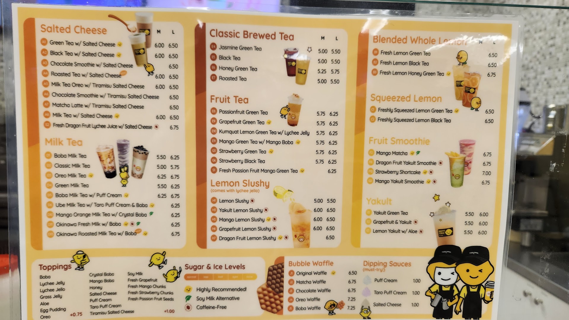 Happy Lemon dessert beverages: I'm a cheese lover so the Salted Cheese Milk Tea (A8) was my choice. Perfect amount of sweetness and the salted cheese flavor enhanced the drink and wasn't over the top. I tried the Mango Lemon Slushy and that was delicious and refreshing. The strawberry black tea was an interesting flavor but definitely works.
