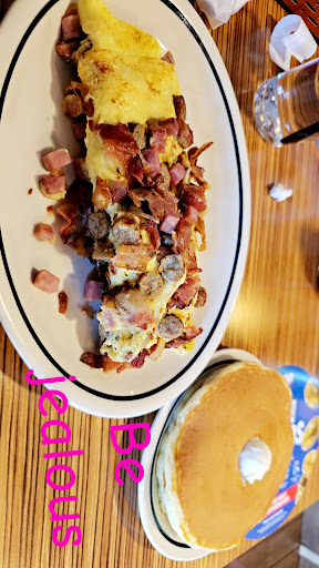Read moreSitting in the comfortable big booth at IHOP with my son, just visiting from London, we both ordered the same thing with a clever name, the 'Indecision's Choice', two eggs any style, sausage, bacon, French toast, and of course, pancakes. I switched out the pancakes for a waffle.