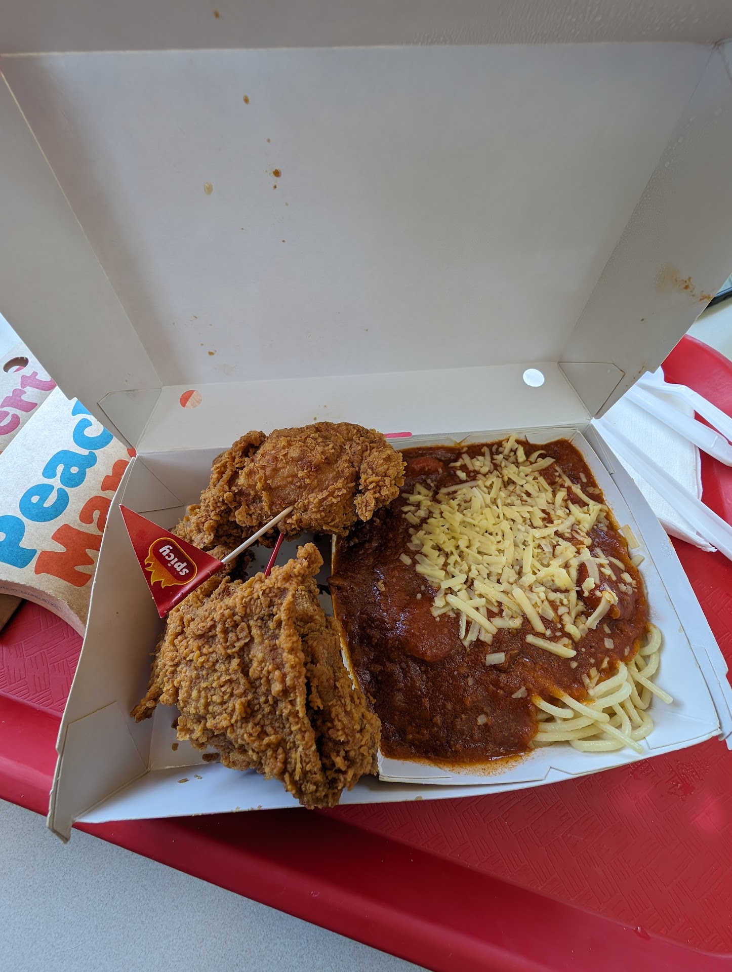 I enjoyed a 2 piece spicy chicken with jolly spaghetti and a peach mango pie. My partner got a 1 piece regular chicken and pancit palabok. Both noodle dishes hit in different ways. Sweet or savory or both with a bit of lemon or mash up with a bite of chicken it all works.