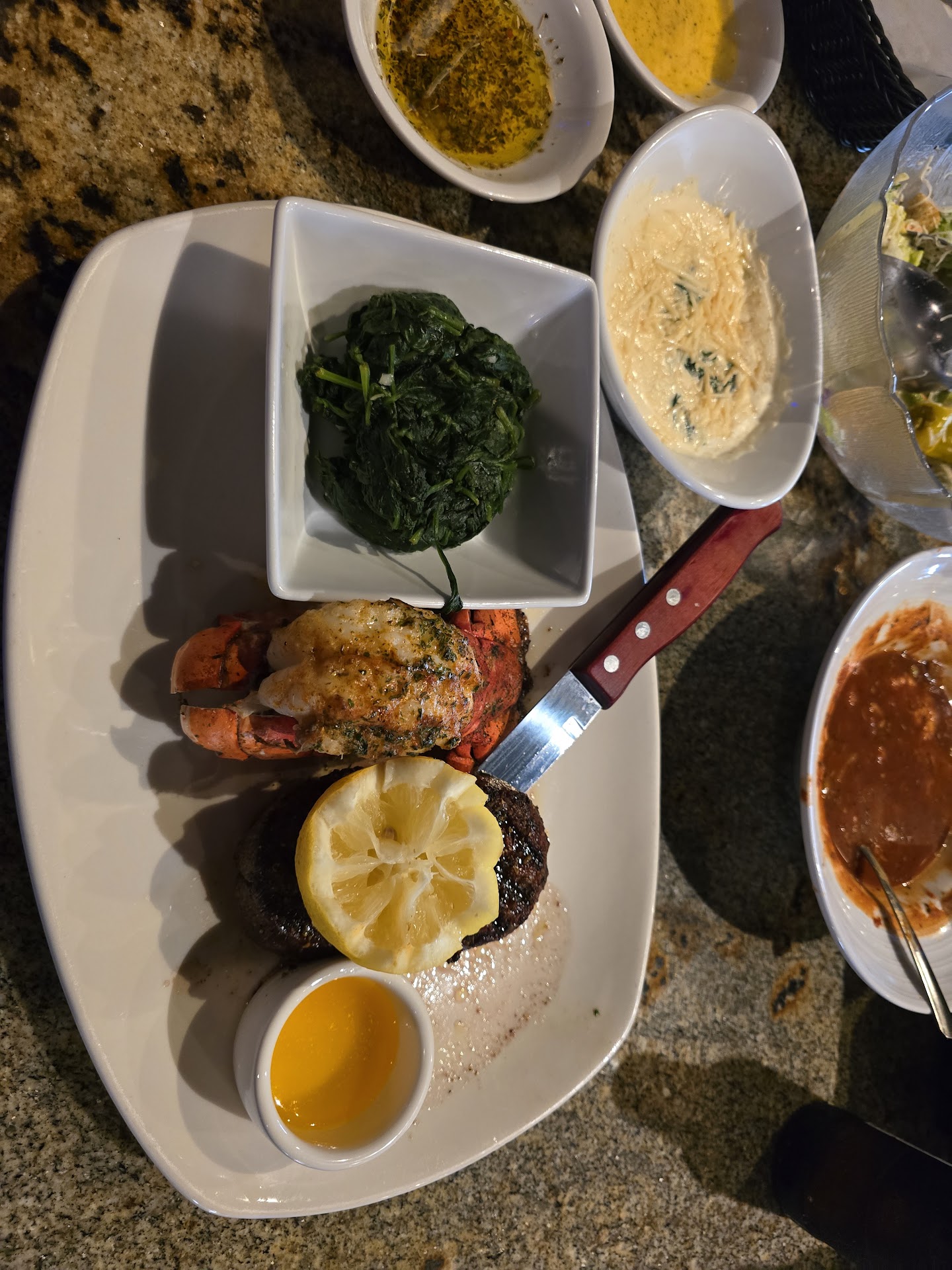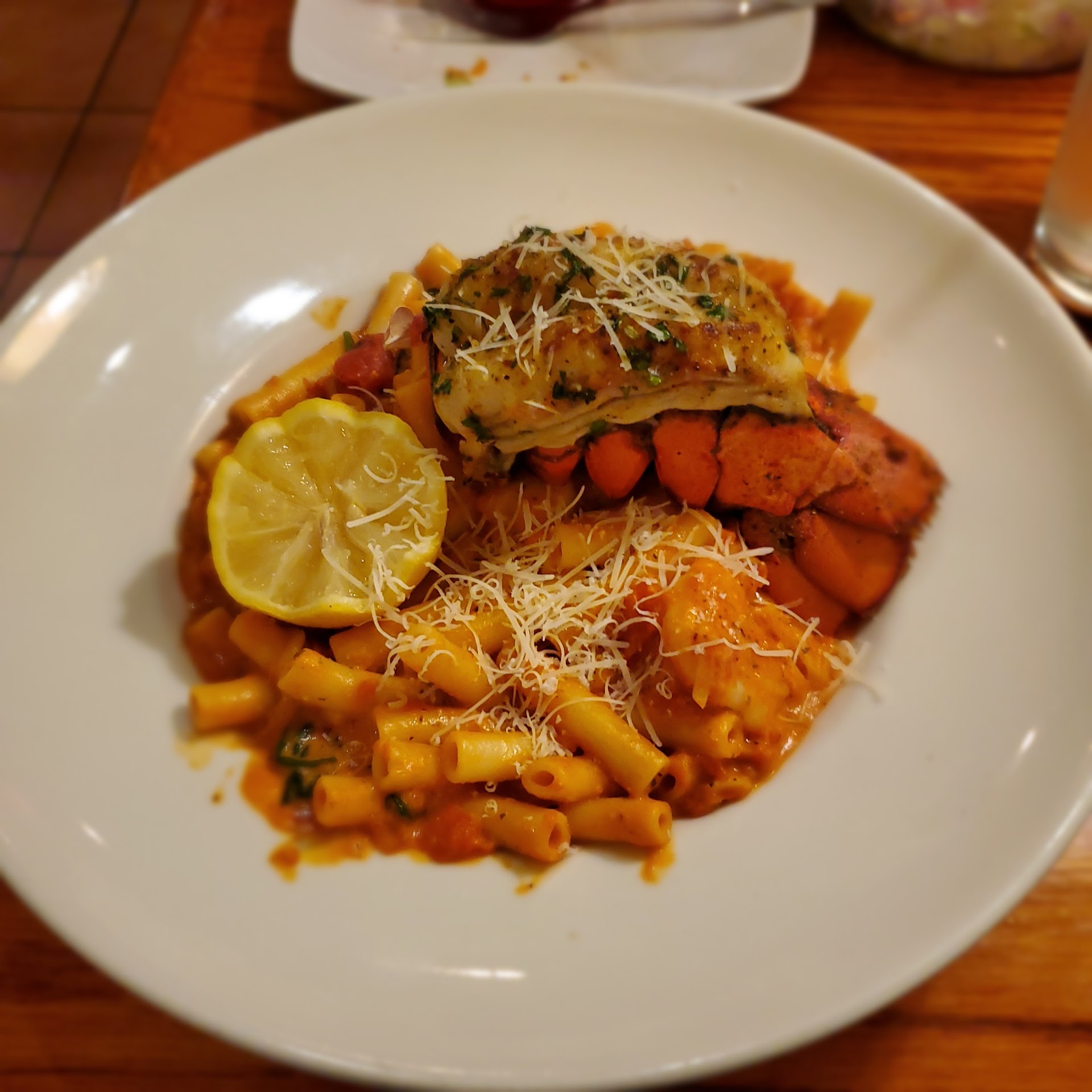 Read moreIt really is a nice place, lots of wood but like so many, a little dark. As usual we ate at the bar, the service was okay, our bartender disappeared a lot, partly a system issue with having to go get water from somewhere else. Also suggest sitting on the left side where the high tops are since there's a waiting area with sofas behind the right side, a perfectly annoying little pocket for parents to not control their kids while waiting for a table. I think the bartender has to go out the right side and walk around to service the high-top tables, a little design flaw. We started with the bread, salad and soup, which all came at the same time. A large salad bowl was brought out for us to split which was good, but I realized I didn't get asked what kind of dressing I wanted, and it had a sweeter Italian Dressing on it, again, good but not what I would have preferred. The soup was lacking in the Minestrone, it was like rich tomato soup with two overcooked noodles and a concept of vegetables. Minnie had the Baked Ziti with copious amount of cheese added. On the other hand, I had the Filet and Lobster combo but ordered off the menu to get the Spinach and Romano Cheese Sauce from the Chicken Menu! While they couldn't make the filet "Pittsburgh Style", it was excellent with a delicious wood smoke flavor and the tiny lobster was divine! The Florentine was made with a perfect, silky cheese sauce loaded with flavor. All in, I'd give this visit a 4.5, but for under $100 with tip, will definitely go back. If nothing else, it was nice to go to a real focused Italian Restaurant that doesn't sell beef sandwiches...