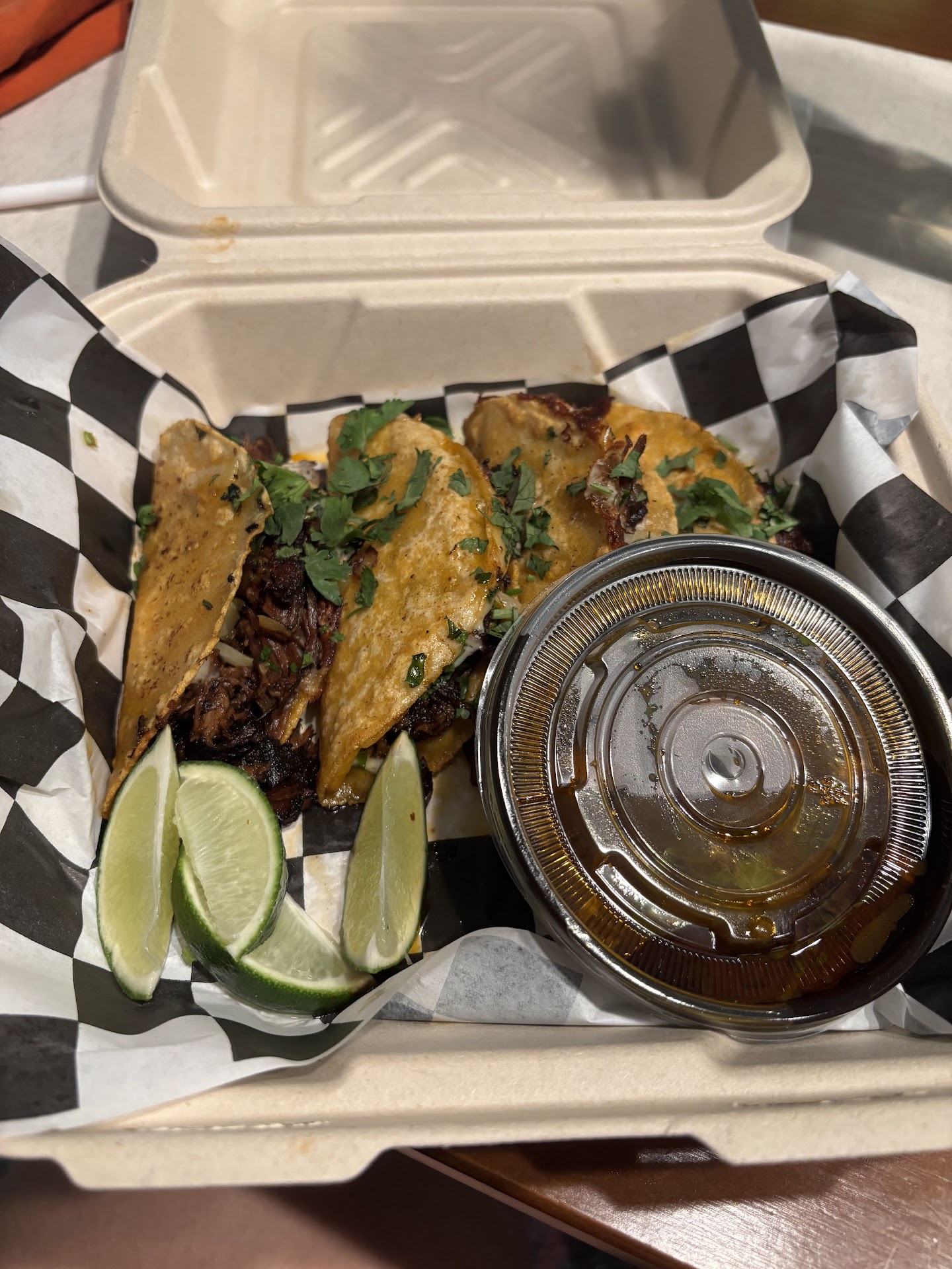 We got Horchata, Quesabirrias and a dry burrito to go. There wasn’t any other noise besides the kitchen staff cooking so ambience is a bit awkward. Notes for food: the order for quesabirrias was 3/5. The meat was really crispy and a little dry. I used limes, salt and green salsa to add a bit more flavor and I would say they were alright for that. I don’t think I’d order these particular tacos again but the food was good enough for me to want to go back and try something else. I did not like the consume. The dry burrito with chicken was good. Plan tomatoes instead of a full pico de gallo made this a little different than most taquerias. Was advertised to have cheese but was missing it. Horchata was okay as well. A little watered down but...