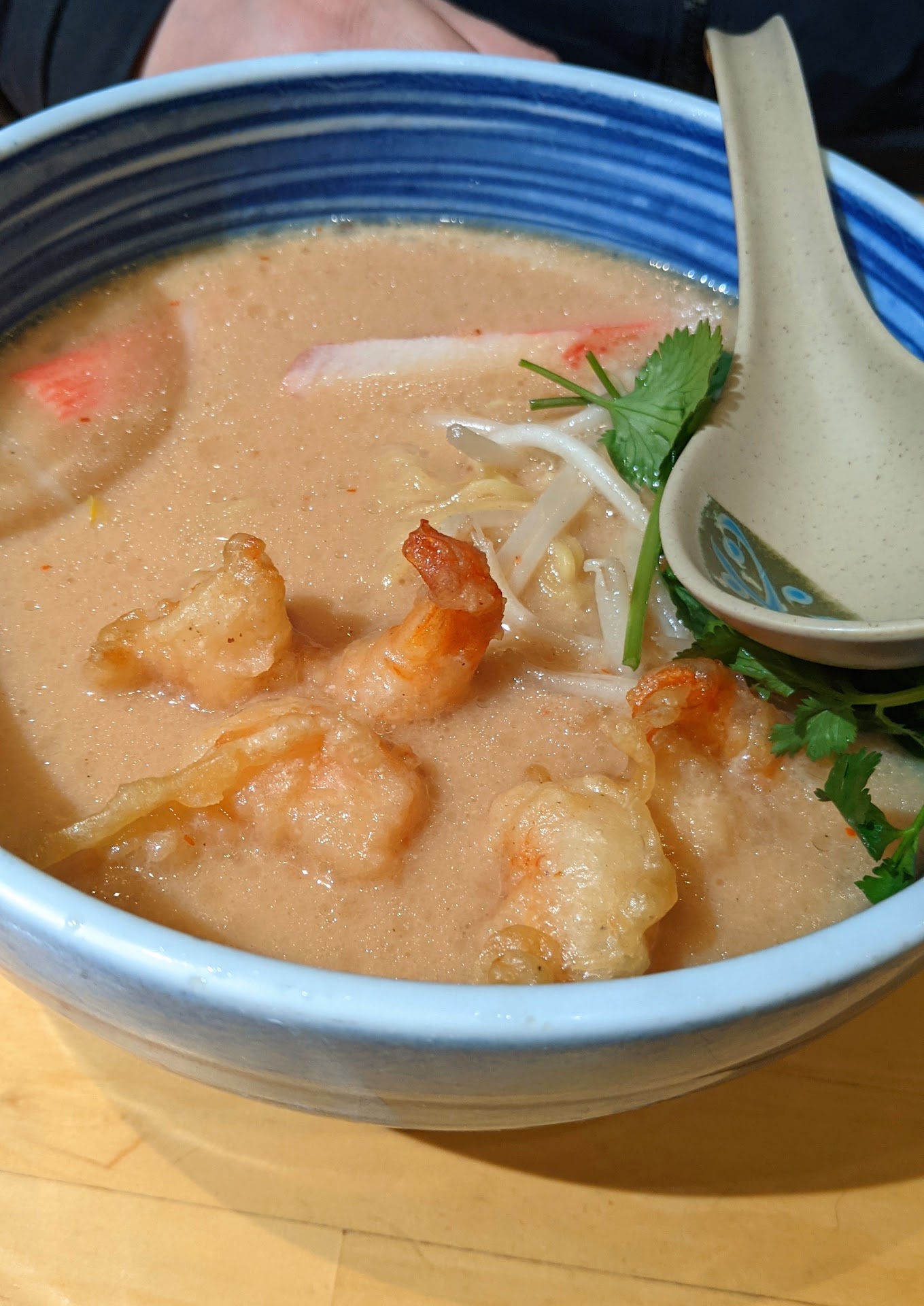 Really glad I drove out there today, especially since I could sit inside for the first time. The whole place smells amazing, has a really calming atmosphere. The Thai sweet chili ramen I got was possibly the best bowl of soup I've ever had. The broth is creamy with a bit of a citrus tang, and the prawns and seared pork belly that come in it are beautiful. I can't describe enough about it, just try it. The miso coconut ramen my boyfriend got was also just as delicious! Also we got the panko fried oysters to start. If you love oysters and fried seafood like I do, these are killer. They have a great tangy dipping sauce.