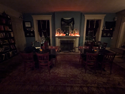 A group of 15 of us went for my birthday to eat and then 13 of us went on a private ghost tour. Elaine, the guide and owner, was very accommodating and informative. Due to us having over 10 people, we could get a private tour on a date of our choice. We went to eat first.. the food was different and very good. We all liked the set up of ordering food and drinks at the bar and finding yourself a table... we got lucky with the private room as people were leaving when we got there. There would have been space otherwise as well. It’s a very laid back atmosphere. The place is super cool with a million things to look at as your roam the many rooms. The tour is highly recommended by us all!!! You get to use ghost tools to detect ghosts after the guided walk through. Such a fun and cool experience. The 16,000 foot square house is just...
