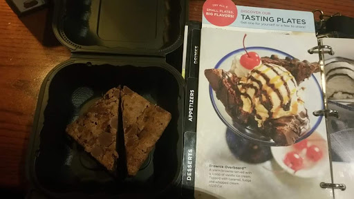 Fast, forward our dinner is served. As soon as I start to cut into my dinner I find a long hair in it. Again, this is just too hard to believe. I send it back to the kitchen and just order a steak. When we asked for extra napkins they brought us paper towels from the bathroom. My meal came with a desert but at this point we are all just ready to leave. We ask for the check and my desert to go. Desert a "Brownie Overboard” brownie topped with a heaping scoop of vanilla ice cream, a drizzle of caramel, fudge and whipped cream. Below is a picture of what I received vs what I ordered.