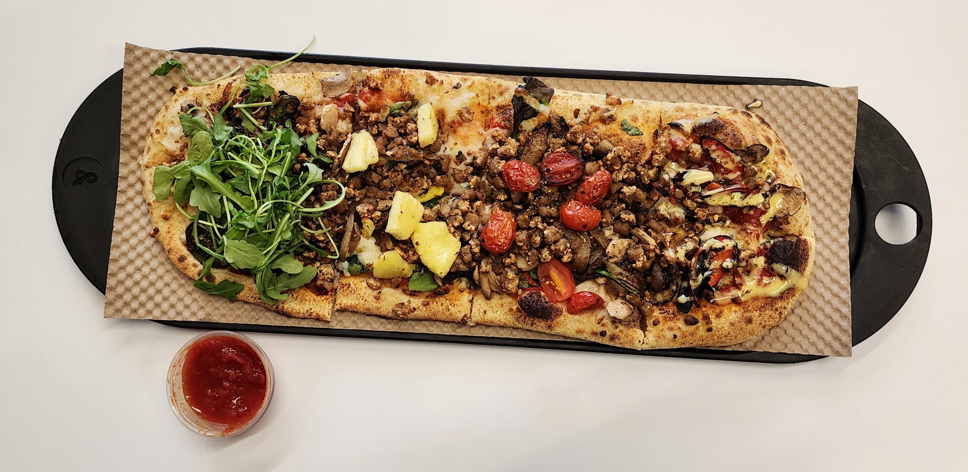 During my visit, I experience good customer service; an employee is very patient helping me navigate Vegan options (especially considering I ask about so many ingredients—I'm grateful). The pizza is in the form of a flatbread (which is a decent amount of crunchy soft) with Vegan Cheese (the goo drip 😋!), Jalapeño Peppers, Baby Half Tomatoes, Pineapples, Mushrooms, Arugula, Vegan Garlic Butter Sauce, Vegan Sausage, and Bing/Bean (not the Vegan BBQ, spelling might be inaccurate???) sauce as toppings. I like the way all the ingredients taste TOGETHER as a flatbread pizza. This is a filling tasty fairly-high protein Vegan lunch! Dining in, I feel as though &pizza is an establishment that needs to be in a higher space like a large fancy building with a lot of employee traffic from other businesses—not on the ground. The interior design is so futuristic it feels like a living pre-concept, I'll find no surprise if the establishment has furniture that recharges electronic devices (or does more) soon. Additionally, I don't have a child/children yet though I have no problem sighting anything for children like baby seats and/or the changing area in the unisex restroom(s). The establishment stands out to me largely from its interior design aside from its respect to Vegan options (Vegan ingredients are put on a meal and set in a way so as to prevent cross contamination between [though close to] non-Vegan products). The establishment takes different...
