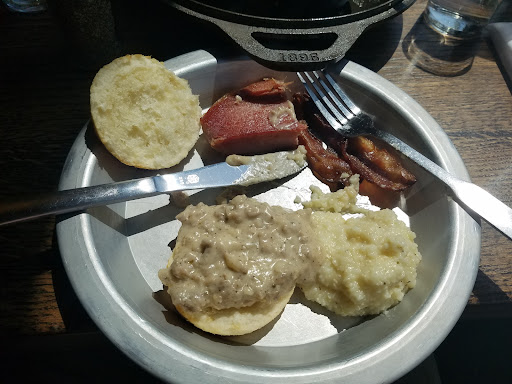 Read moreA date and I split the prospectors plate, add a small side of jam , black and blueberry. That got us each a biscuit, a solid amount of ham and bacon, and we also ordered a side of cheddar grits to go with. Despite the fact that I wanted to substitute the ham for additional bacon or sausage link, and they wouldn't do it, I was completely thrilled with the meal. The Black & Blue jam was a little sweeter than I normally like, but it went very well with the buttery, salty, and yet flaky biscuits. The ham I wanted to substitute out might have actually been my favorite part of the meal, with a Generously smoky cure put on the meat I was able to enjoy it despite a taste aversion to most cheap Ham, this was nothing like that. This was true genuine country ham, not a oversize chunk from the lunch meat counter. The bacon was crispy and good, though that's hard to mess up in my opinion. Cheddar grits had a serious amount of cheese in them, but with enough pepper I mixed them up and made a spicy balance for what I was going for. The sausage sawmill gravy on the biscuit hit one of my favorite comfort food highlights, fatty and indulgent and delicious! server was new, but she was very friendly and polite, she ran to check with the kitchen about substitutions and asked questions for me when I was being difficult, she brought us drinks, she was never pushy, and she was super friendly to the point of conversation that actually held up our ordering. Not holding that against her at all, it was a good sign. Felt very welcoming. The cool space, great food, and was affordable . Definitely...