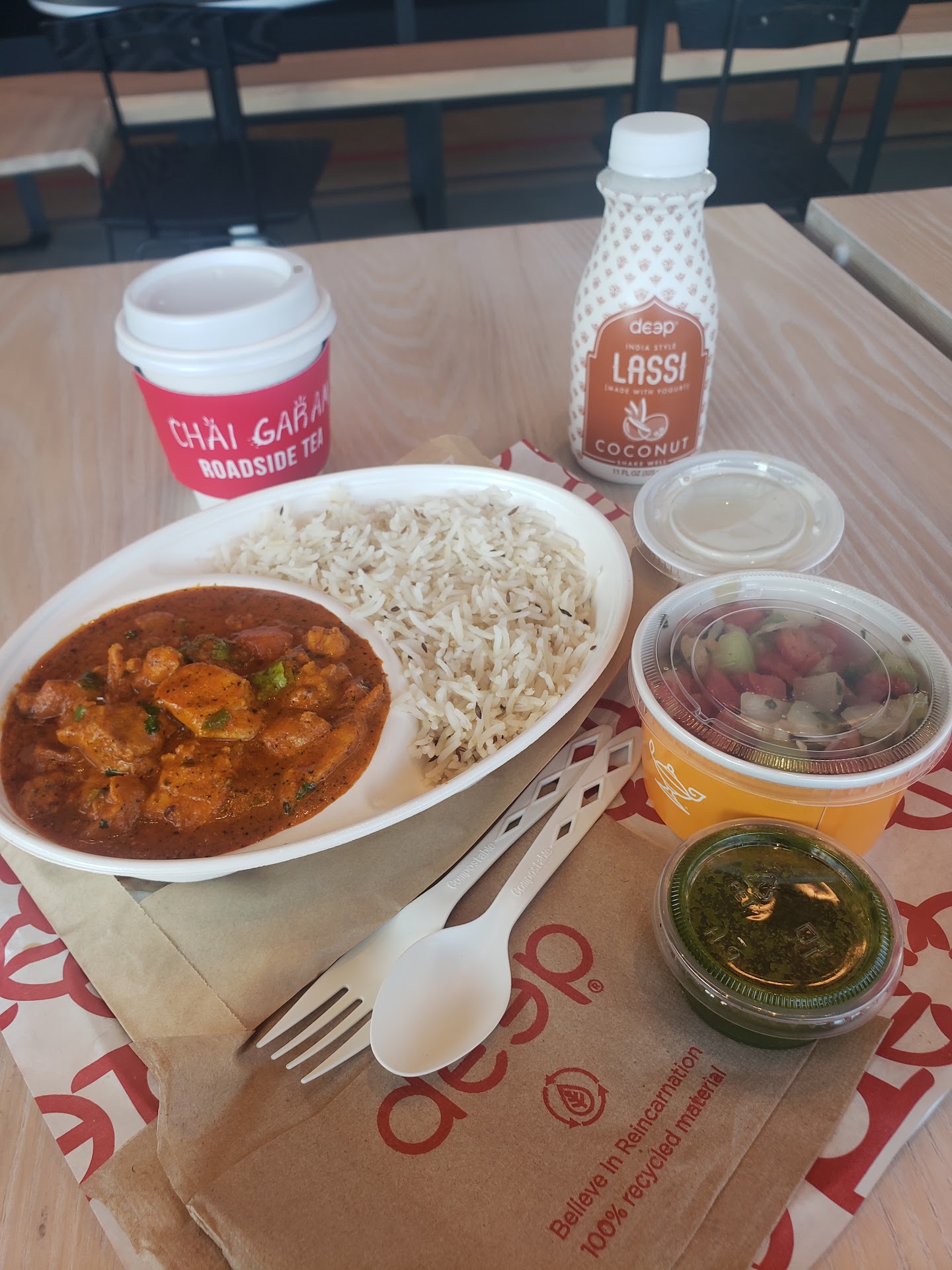 Instead of chicken samosa, we were given goat samosa!?! š¤ Chill chutney was sweeter than spicy. What a shame. Biryani was bombarded with cilantro. After sorting out 10000001 pieces of cilantro, biriyani tasted alright. Spice level was just ok for me but a little too much for hubby š. Dal was ok. Nothing to rave about. The original samosa was pretty tasty. But the goat one, I couldn't stand the smell, hubby said it was okay. Their soft serve machine was not working so they gave us mango š„ lassi, which hubby wanted to begin with, but kiosk didn't show that option?!