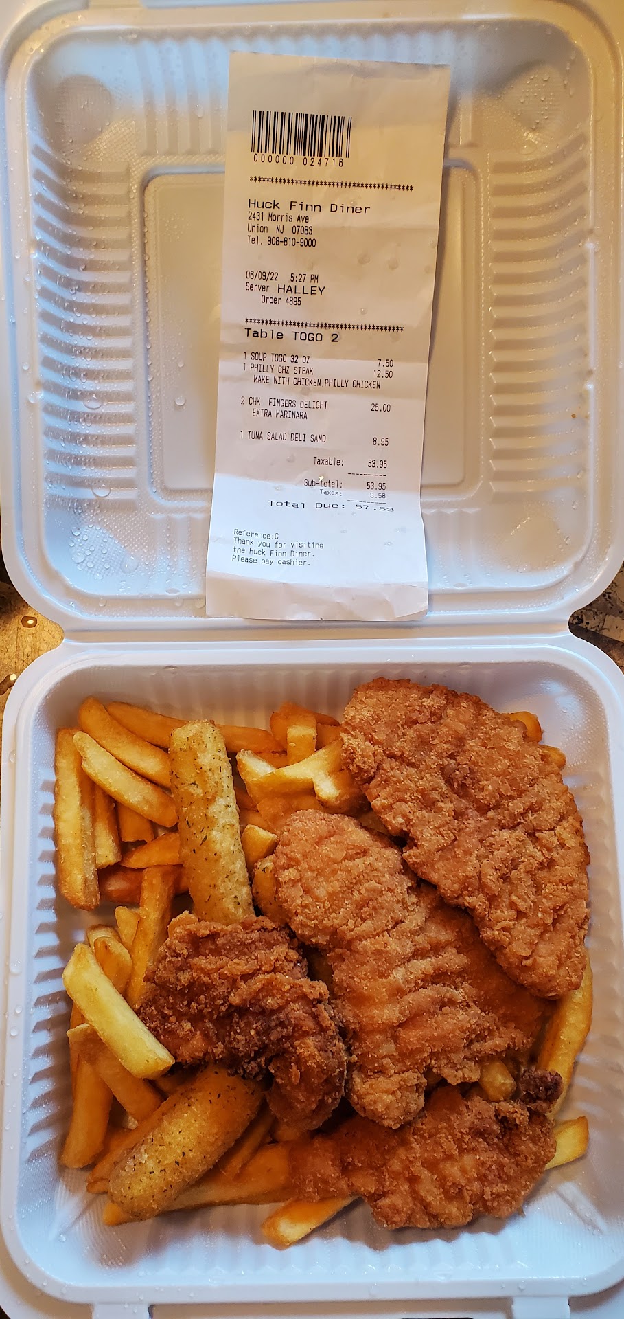 Read moreFound this place on Yelp while on the road and figured I would give it a try. I ordered a half roasted chicken with two sides, and a cup of soup. I didn't know the meal came with a salad bar, but it was a nice touch. Salad bar had a nice selection and it was fresh and full. Pea soup was very tasty. Now the bad part. My roast chicken was presented to me along with my carrots and baked potato (these two sides were actually quite good). I immediately noticed that the chicken did not look right. Heck, anybody could have seen that it didn't look right. It was extremely hot and had the look of being over-microwaved. The skin appeared to be nuked to oblivion and the drumstick and wing were cooked to a point where they were totally dried out and stringy from the microwave. When I put a fork to the chicken to separate the drumstick from the body it hit me. The smell was horrible. It was a combination of being over-microwaved and being on the verge of being spoiled. I still have the smell in my nose. I pushed the chicken aside and ate the potato and carrots. When asked, I informed my waitress of the above and she said she could smell the chicken from her side if the counter. She quickly offered a replacement, but I refused, due to the fact that the salad bar, soup and sides filling me up. I saw her talking to her boss for a moment or two and she returned to tell me she deducted the chicken from the bill. However, after looking at the check, the "free" salad bar was added to the bill, which I thought was pretty lame. When I paid the bill, the boss gave me a stock-sounding apology while handing me my change. I did not expect them to give me a free meal, but discounting me only $5.00 and charging for the free salad bar was poor customer serve IMHO. I gave my very capable, friendly and apologetic waitress a 50% tip and put the Huck Finn Diner in my rear...