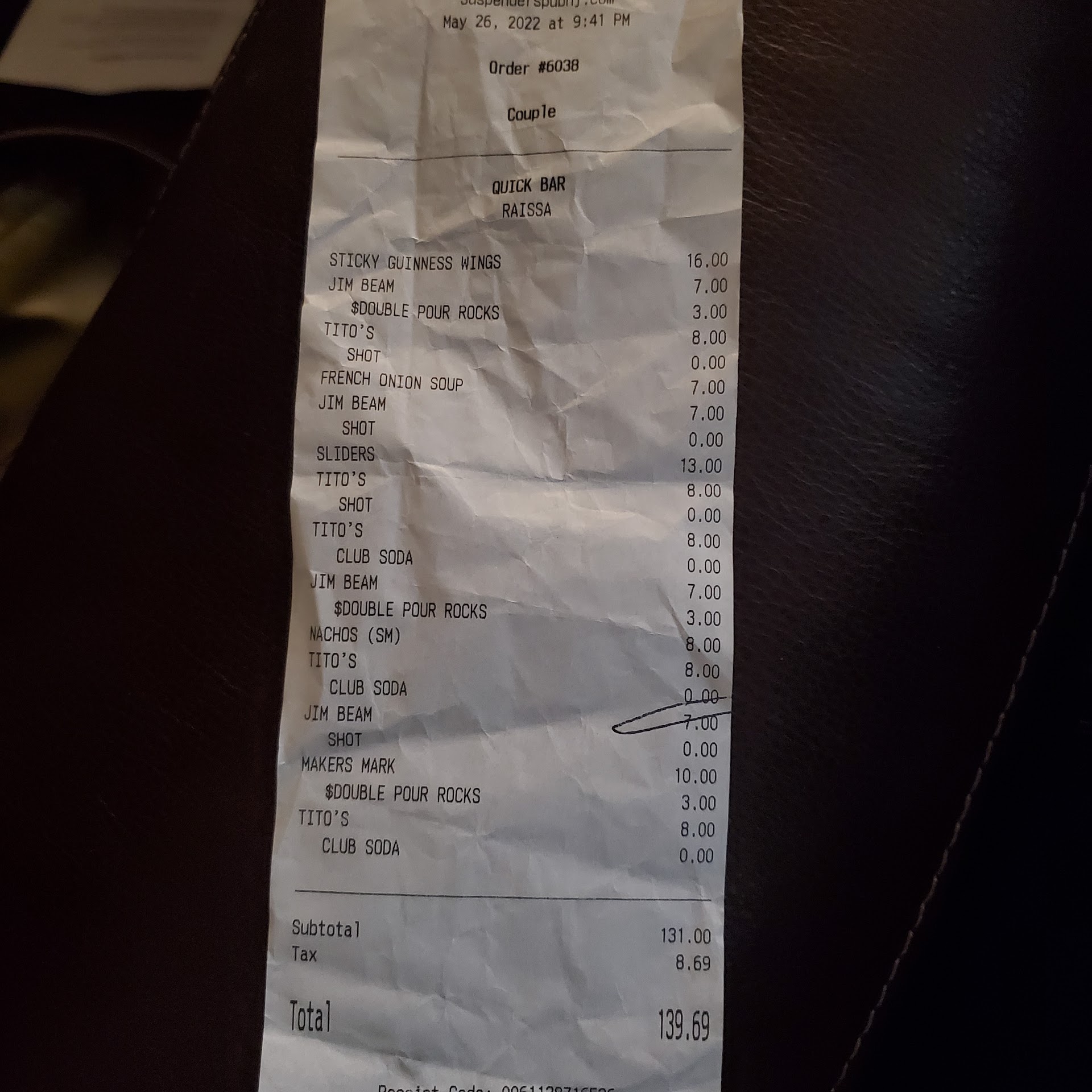 Read moreI am putting this first so no one misses itâa 20% tip is already added into your final cost. The receipt you sign also has a space to add a tip. DO NOT DOUBLE TIP!!! We went to Suspenders because our other local, Tiffs, recently closed. The food was fineânothing spectacular. Wasnât bad, wasnât anything to brag about. The cocktails were great. Sadly, it just didnât hold a candle to the food or ambience of Tiffs. It was more expensive for a more basic menu. We had the smash burgers which were overpriced. The Philly cheesesteak was good. The chicken tacos tasted like they had mayo on them rather than Asiago. We also had wings and fries. The fries were the best part of the meals.