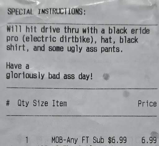 Read moreIf I was flushing with cash, I'd likely only eat at subway. Good food, like the employees, and leave them special instructions like the image each time I order. They always tell me they really enjoy my instructions.