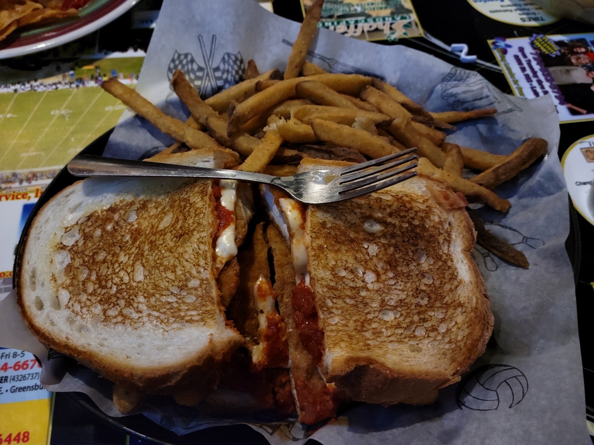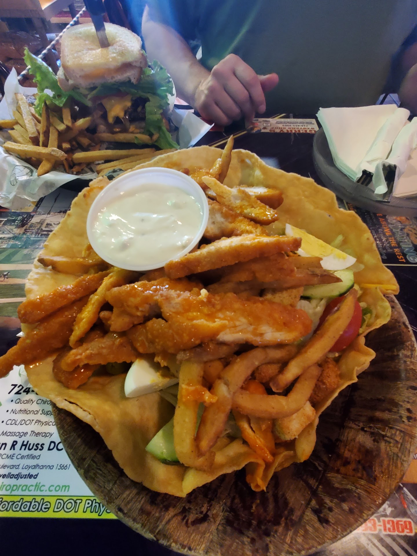 The menu was your usual sports bar fare - my wife had their Buffalo Chicken sandwich - a massive thing she could barely eat half - though she enjoyed it quite a bit. I had their fish platter - baked - no complaints. The service was friendly and super patient as we had lots of questions she fielded - great job by her.