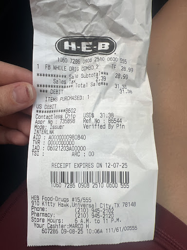 Read moreFood is always good but the man with tattoos on his arms at the front is extremely rude and obviously lacks customer service experience. Nothing mayor happened but it was the way he responded to my question in a nasty demeanor. I went up 20 min before 10 not knowing they werenât open yet & asked how long before the chicken was ready, he responded in a plain rude way stating they werenât open until 10 which is fine it was the way it was stated. I left and came back at around 10:02 he looked at me and waited a little before walking up to me I asked if I could get 2 birds & yet again asked me to give him some time because they werenât open yet, so which was it? He was obviously just annoyed because I was back to buy Iâm guessing? Iâve never experienced anyone else working here at heb to be like that but he was pretty shitty. This happened today on 9/8 His...