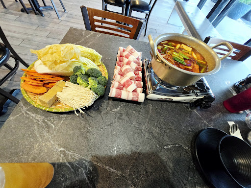 . Bun cha Ha Noi: grilled pork soaked in fish sauce with rice vermicelli and green . Pork egg roll has an interesting square shape, taste like traditional Vietnamese egg roll . Couple Hotpot, we had Tom Yum Broth. Not sour and spicy enough for our taste, had to adjust the flavor with condiments on the table. Served with flesh thin sliced beef and fresh seafood. Also, a varieties of vegetables was provided ( bokchoy needed to clean more throughly). Portion of the protein is not enough for 2. Honorable mention!! The chili paste is supper spicy...