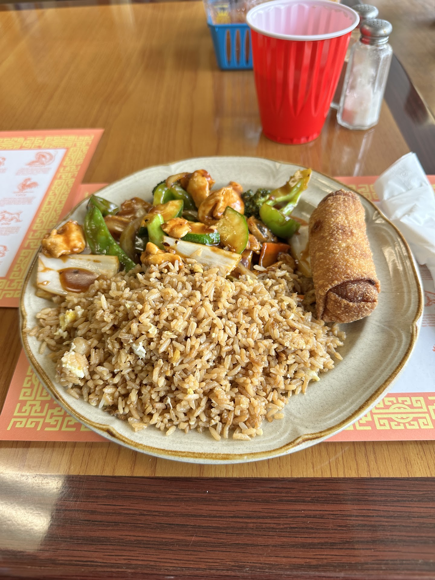 The wonton soup didn't have a taste to it but I will say I probably had the biggest chicken egg roll. The happy family Entre was okay and glad that we shared because the portion was big but when they brought us the fried rice, I was a little hesitant. It was basically regular rice tossed in soy sauce. When I was playing around at home I think I made better fried rice then this. In all, I will say that I doubt...