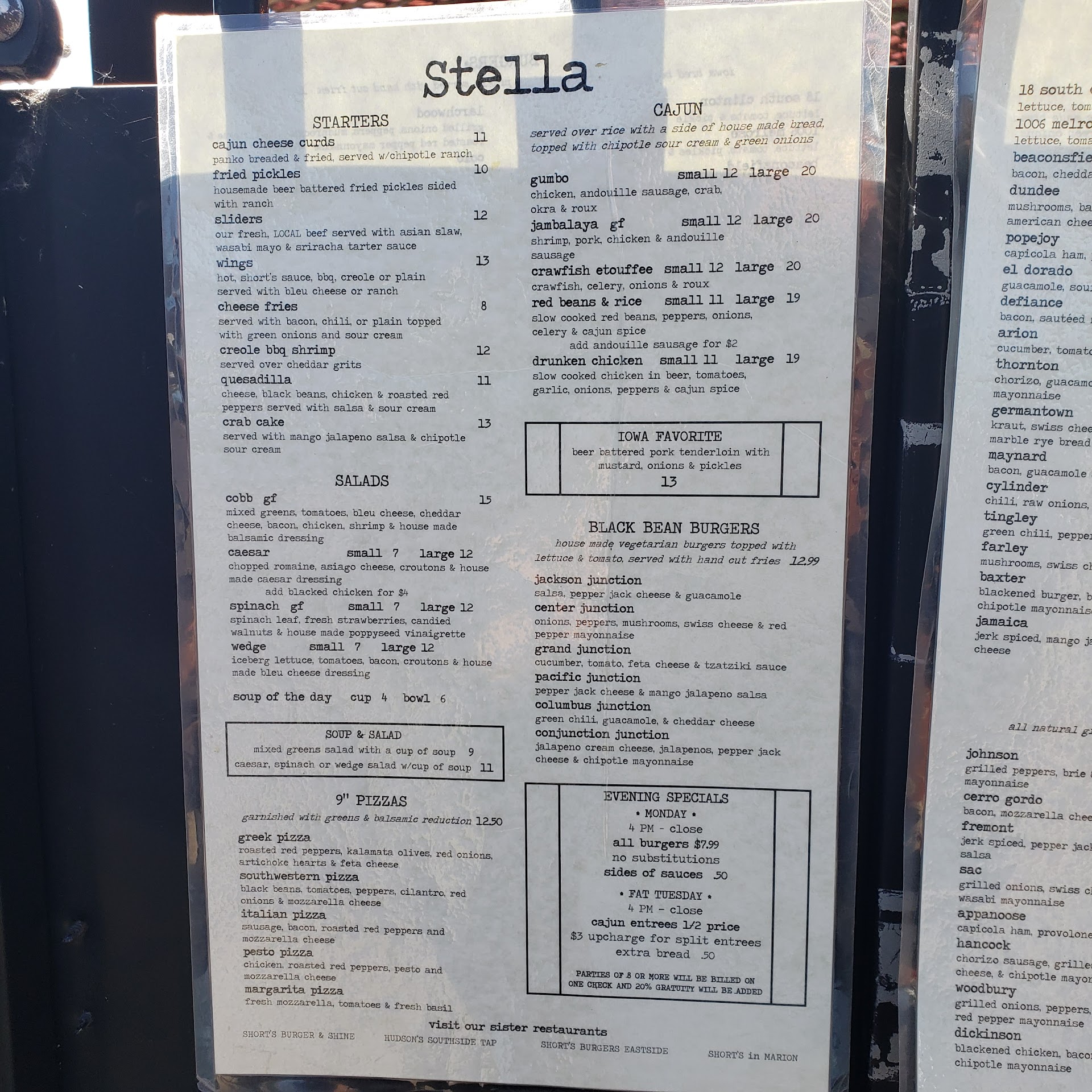 Read moreWe dined for lunch today at the suggestion of a few Doctors and a Nurse from University of Iowa's Medical Team. Upon review, we noted Stella's had a 4-star rating so our hopes were high. When we arrived it was nice to see the iron gate entrance with a double patio and easy access to menu posted outside the door. We entered and were promptly greeted by Darren. SUPER Energy. He sat us and took our drink order. The environment was very laid back. Fans were running as there was no AC that we could tell. We were quite comfortable with the fans; however, we do think they need a good cleaning. Despite that, Darren took our order. I can't figure out how he can have that much energy in the heat, yet he keeps pouring it out. While we waited, we came to the conclusion that Stella is a hidden gem and a dive. A place that Guy needs to know about. I digress. We order the Cheese Fries with Bacon. The fries are cut in-house. When they arrived, they were packed with cheese and covered in bacon. It was like a bacon explosion happened on the plate. The fries were good. We believe if they twice fried them, it might make them a little more crispy. Our party devoured them. We ordered three different burgers - a Tingley which has green chili, pepper jack cheese, and guacamole - a Beaconsfield which has bacon, cheddar cheese and BBQ sauce which we believe to be house made - and a Colo which was American and Swiss Cheese on rye bread with grilled onions. We elected to have raw onions for a crisper bite.