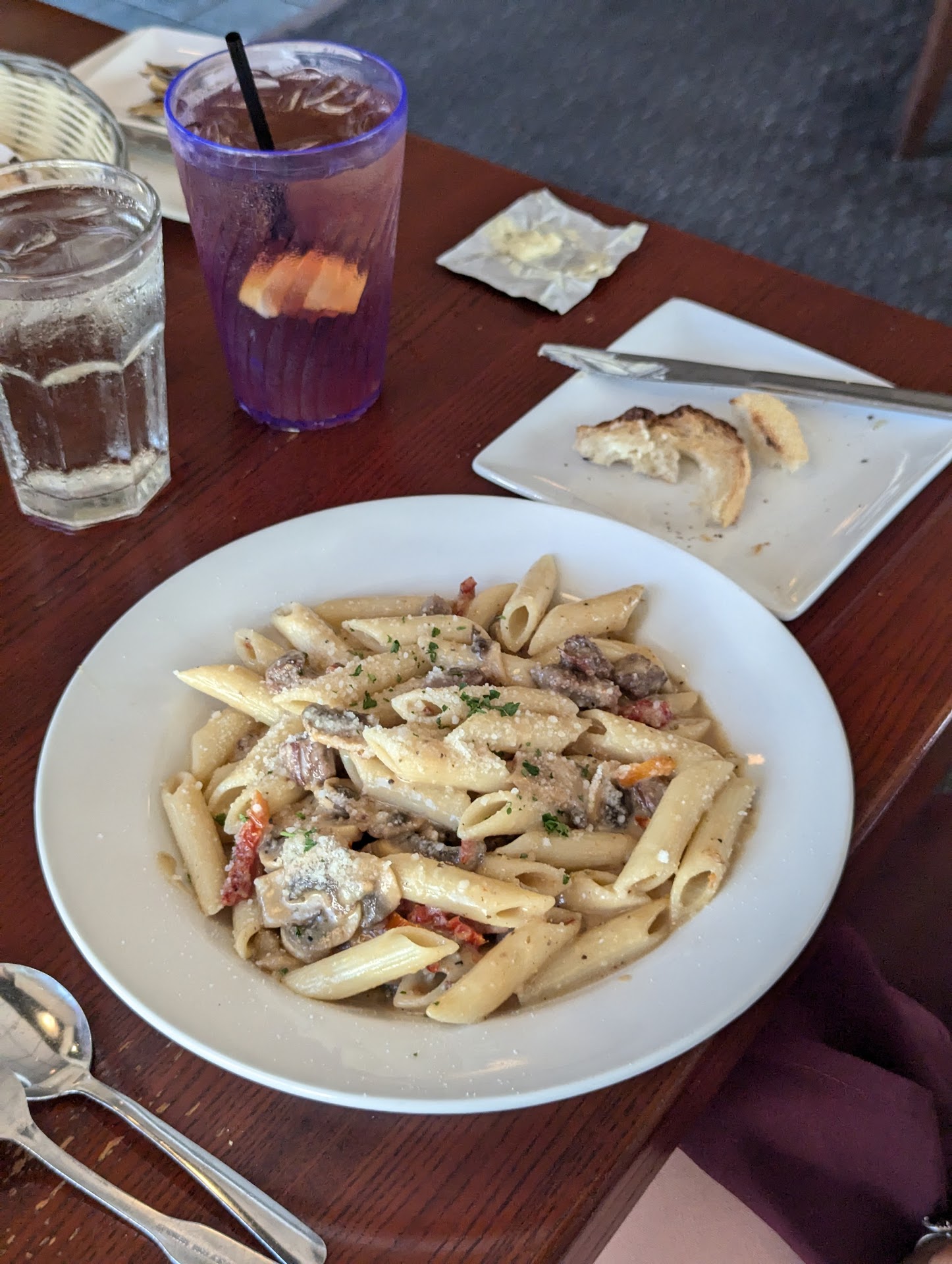 Service: We went on a Wednesday at 11am, and we were the first people through the door. I liked that the waiter didn't hound us since we were the only ones there, he just served us at a leisurely pace (lunch took an hour-which was fine with me). He was great with service and even packed our leftovers and gave me an extra large ice tea to go!