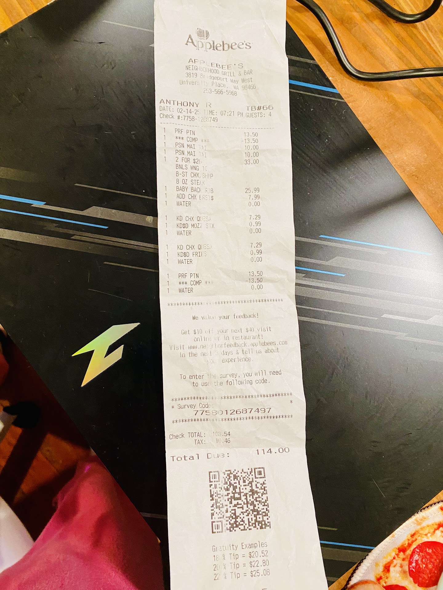 I took my family to Applebee’s for dinner tonight, and unfortunately, the experience was extremely disappointing. While I understand that our server was new and inexperienced, he did try his best. However, there were multiple mistakes throughout our visit that made the evening frustrating.