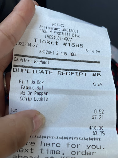 Drive thru was really slow, not sure if they were short staffed on Sunday. Drive thru person was lazy, didn't want to hold out the Apple pay device further and I couldn't reach out any more due to my bad shoulder. I had to ask for her to do this before readjusted the length of her device stick. She then handed me the drink and later food without a word. Not even a sorry about that or have a nice day. And she forgot to give me my receipt. I live in Upland, but I won't be giving my local KFC any further business for now. They have decent quality food, but bad service. I'll keep going to the San Dimas KFC instead, it's on the way home from work and they have much...