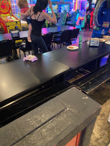Ambience: Tables, booths, and arcade gamesâall games on game cards ($10 for 200 credits). Busy with families and kids. The kitchen staff looked hotâliterallyâso a fan in the kitchen would help. The restrooms could use some attention as well.
