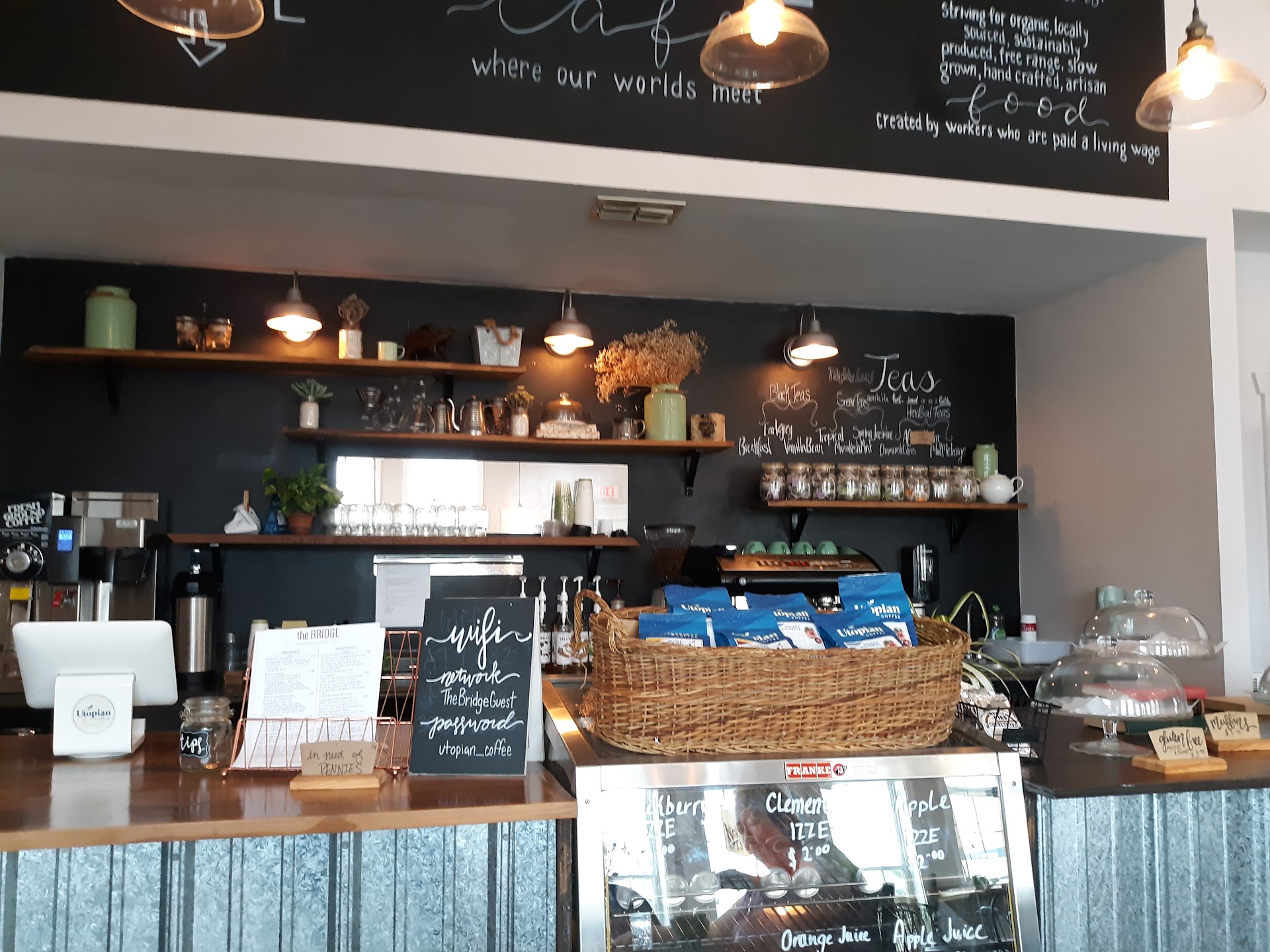 The Bridge is a unique experience for anyone going through Upland, Indiana. Unassuming on the outside, cozy inside. This is a perfect place for a cup of coffee when you can stay and hang out with a friend, but also works great for brunch, lunch, or take out. The menu, while in some ways straightforward, also has a flair to it. They advertise organic ingredients from their farm and things have a handcrafted feel.