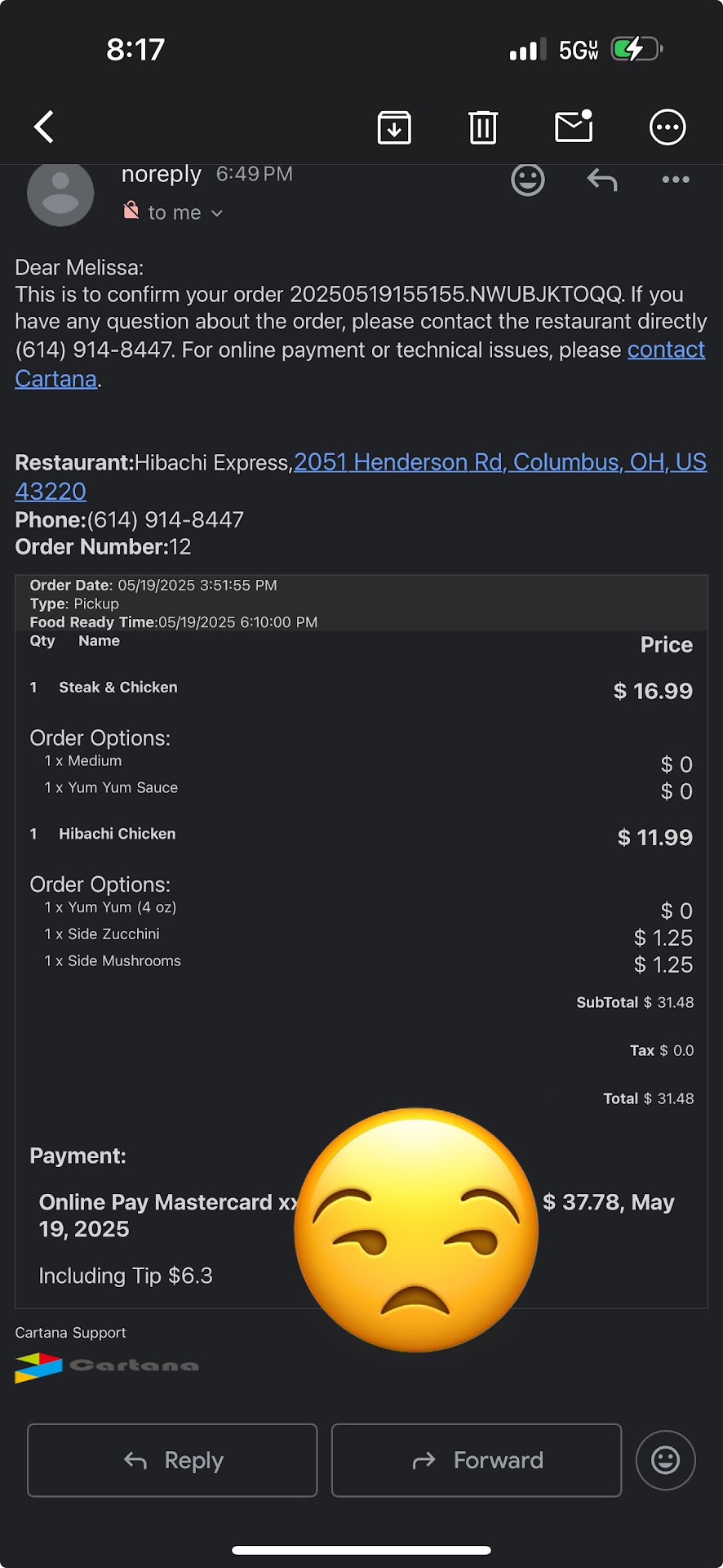 *edited at 8:20 to include picture of receipt sent by the restaurant after this entire ordeal and my original review was posted. They also sent a text message with the link to my original order placed just before 4 pm, but no apology for their disrespectful...