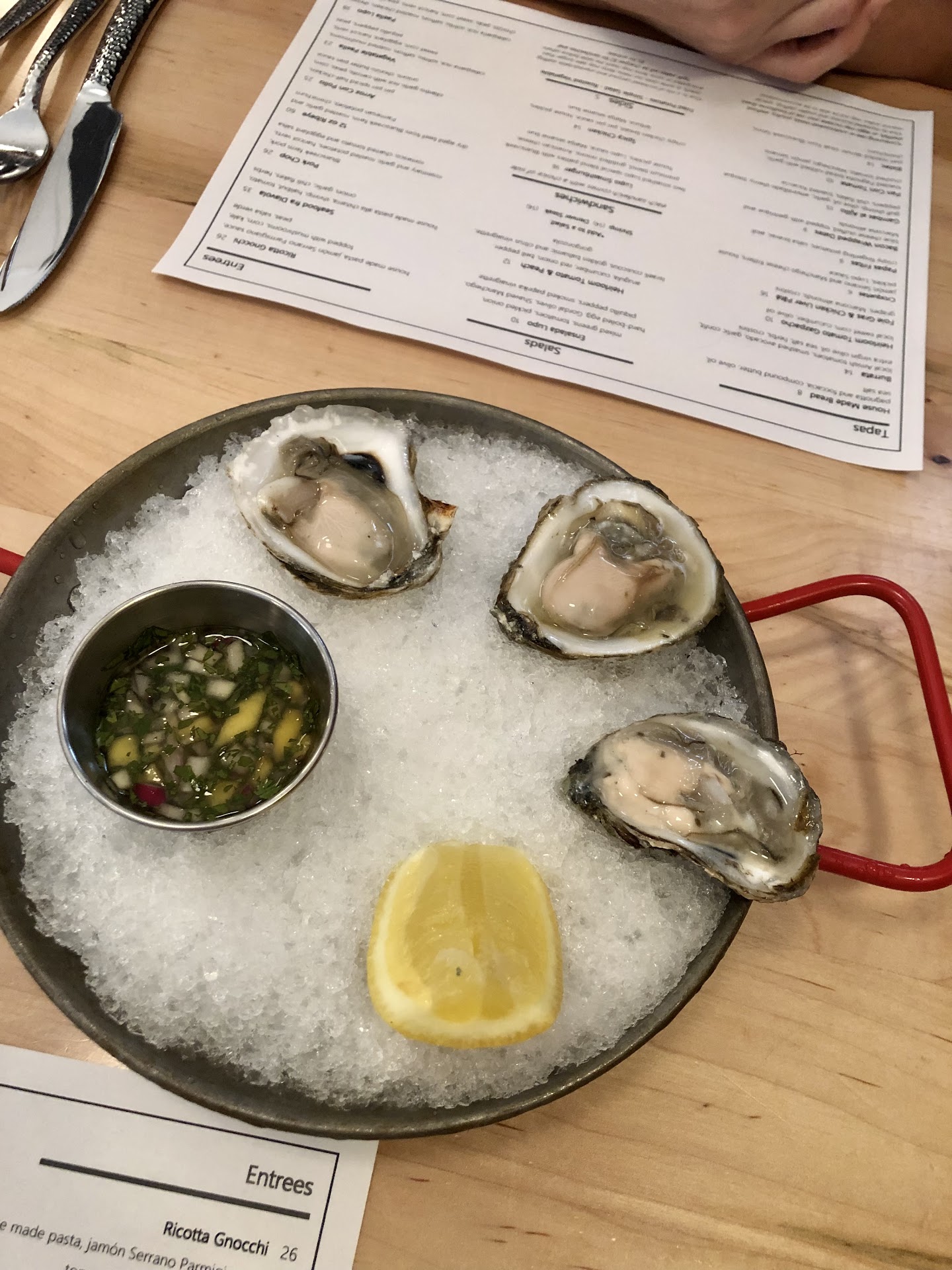 The food was good. We started with a salad and the burrata both were very good. My partner had the steak and I had the chicken. I thought the chicken was well prepared, the steak had a sweet corn sauce that was very sweet. We didn’t get dessert.