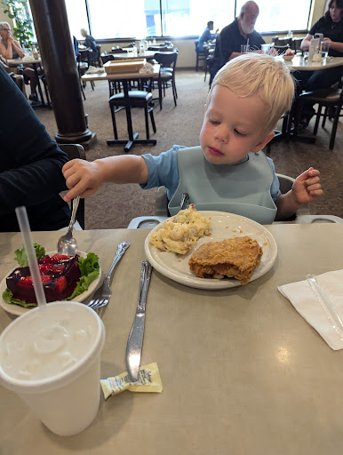 Been coming here for a long time now with my family so now I'm bringing my son. This place has been a staple in my life for meeting up with family so you could say it has some nostalgia in it for me. It's exactly what it sounds like, set up cafeteria style but don't think that shares any resemblance to your old school cafeteria. The food is far better and consistent. Never had any issues or a bad meal. Everyone that works there is very friendly and helpful, getting through the line is quick and they'll explain everything to you if you have questions and at the end you take your tray sit down and enjoy! Most recently went with my son and parents, he got the childs portion with a chicken thigh, mashed potato casserole, jello and a blueberry muffin (he thought it was a cupcake and yes that boy can put down his body weight in food it feels like sometimes). I got their stuffed chicken which is always a solid choice and some strawberries (I didn't get a full meal this time around so if it looks light, I skipped the sides). Everything was great and he loved it so mission accomplished. If you're looking for a laid back atmosphere, friendly staff and good food check it out, maybe it'll become a tradition for...