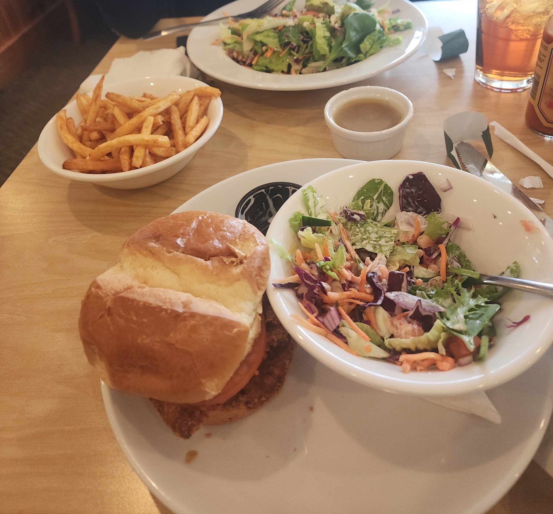 The food was not great at all, if you get a salad, be prepared to get almost all romaine cores instead of leaves. And don't bother with their crusty, dusty, inedible chicken. I could not even chew off a piece as it did not want to break apart. Instead the toppings and bun was all I could bite off. Also don't get me started on the price. As our full order was a salad, 2 drinks, a sandwich and a side salad. It came to almost $50. This is outrageous. Not to mention they did not give me the pickle that comes with the meal.