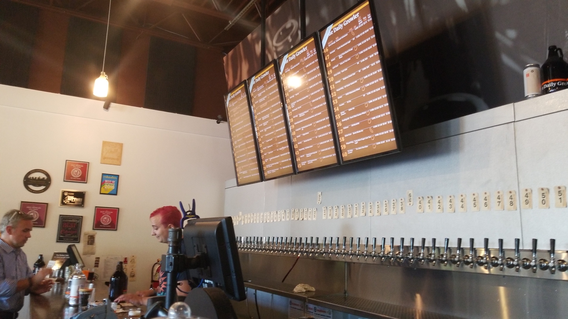 Points off for ambiance. Harsh light in a concrete room. I usually just grab a growler and go, though, so not that big a deal. They also have a tiny patio where you can sit and drink or front.