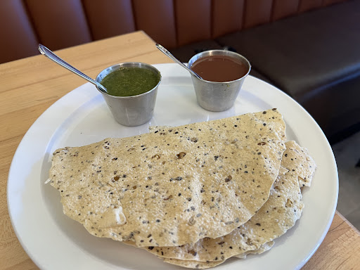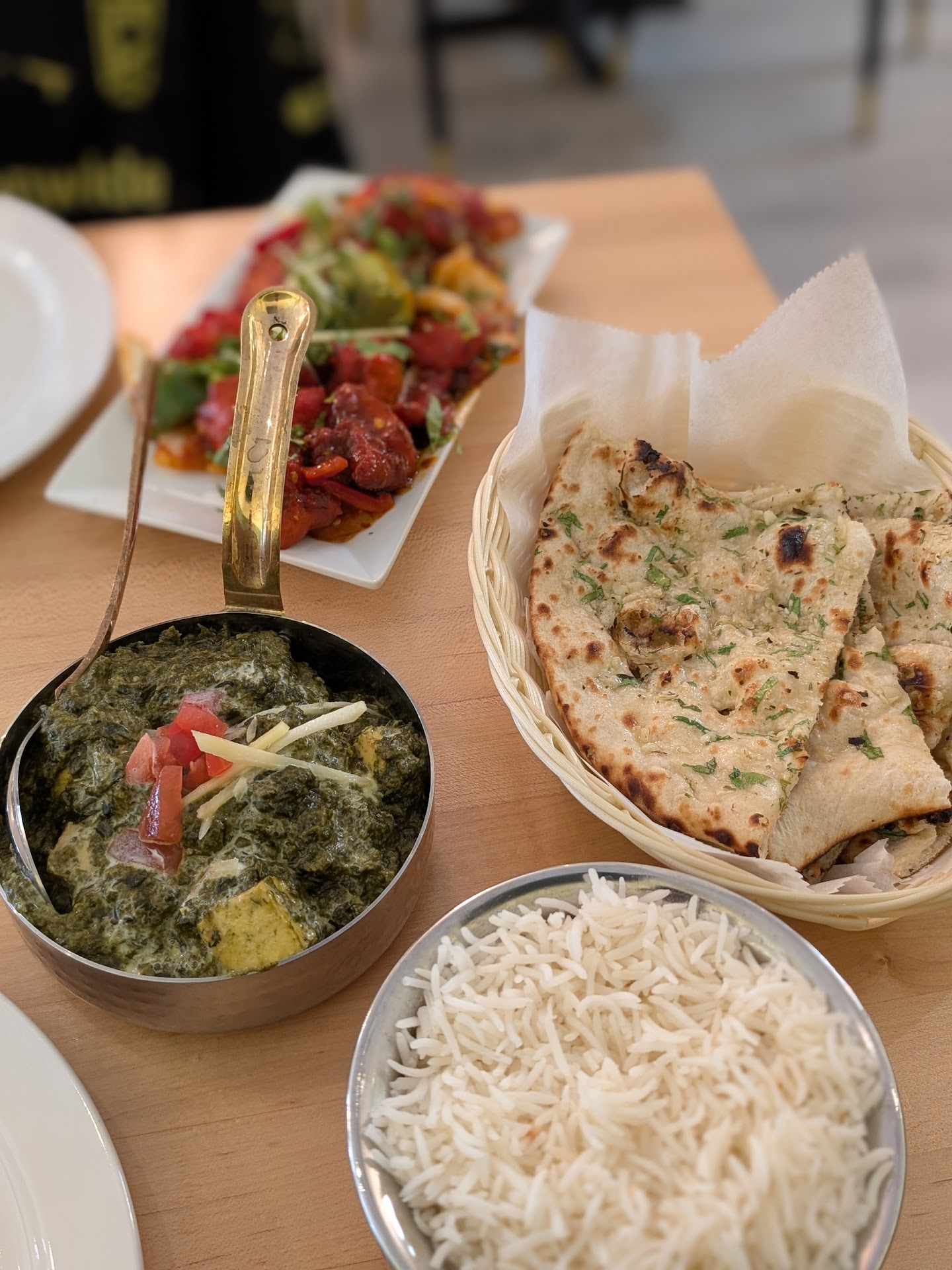 My husband and I stopped in for a late lunch/early dinner on a weekday. We were the only dine-in guests, but at least a couple of carryout orders came and went while we dined. We ordered vegetable samosas, shrimp curry, aloo gobhi mutter, garlic naan, and a mango lassi. While we waited, our friendly and attentive server offered us complimentary pappadam with hari and tamarind chutneys, all of which tasted freshly made. The mango lassi was smooth and fragrant, and a deliciously refreshing palate cleanser. The samosas were the best I've ever had: plump with potato-and-pea filling, crisp but not heavy or greasy, and just the right level of seasoning and spice. My aloo entree was beautifully presented, with slivers of ginger and other fresh veg as garnish. The flavors and accompanying rice were perfect, and the toasty soft naan paired well. On the downside, the place's atmosphere just feels unfinished. Although the space is open and clean, it doesn't have any personality, the lighting has a bit of an industrial effect, and the TVs are a detraction (as they are everywhere except a sports bar, dangit!). Perhaps they're relying most on those carryout orders? But with a location in a highly walkable area, I do hope the restaurant's interior majorly improves. Until then, we'll definitely visit again just...