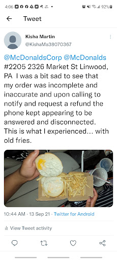 Ā Ā Ā Read moreThis Mc Donald's is by far the absolute worst!!!! Have been there b4 and had not so great service but tonight was absolutely horrible. I'm talking 10pm. Not dinner, not lunch 10pm. Drove up to the drive thru speaker ..a few cars were ahead of me but not at the speaker. I sat at the speaker waiting. Finally after at least 5/6 minutes I said hello is anyone in the mc Donald's to take my order??? The screen where the order usually shows up was blk. Finally a girl came on and said I will be with you in a minute. Ok great I thought....well 10 minutes later...horns honking behind me and 2 card behind me now have bailed out of the line pissed off. I finally say again..hello???? No answer...so out of the line I go too. Pull over past the 2 windows to see a large girl standing backs/sides to the windows on their cell phones. No cars in front of me at this point. No orders to fill...maybe 3 people sitting in the mc D's eating... This is the worst drive thru experience I have ever seen. Just blatant disregard for customers. Everyone in there should lose their jobs!!!!! I manage a dessert walk up window and can not believe these employees work "I say work loosely" In customer service. I would like to give no stars to this mc Donald's but it wouldn't let me. Do Not Go there EVER!!!!!...