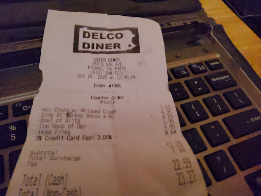 Good evening Google Family. I visited for the first time today. This place is the site of the old Gelato establishment. I googled breakfast places and I decided to come here. My friend and I were scheduled to visit PenRose Diner today but since my sanitation buddies were late today and my friend had to work today, we rescheduled the breakfast until Thursday and now we have decided to come here on Thursday. My server was NIcole, who was so enchanting. NIcole kept me company the entire time I was here since I was dining alone but I never felt alone. We hit it off right away. I ordered grits, turkey bacon and home fries. They give you a lot of home fries. I had ordered hot chocolate to start my breakfast and then I ordered some chicken noodle soup. Everything was so delicious!!! What I loved about this spot was that it is intimate and quaint. Not a lot of people here and the restaurant is small. Just right, with just the right amount of tables and chairs and booths. There is plenty of parking outside in the parking lot. Also I visited the rest room and they have one for women and one for men. The rest room was nice and clean. I totally enjoyed my stay and experience here. I was over the moon when I asked a take out customer to purchase Yolanda's children's book, "Brown like Me" and she did. Nicole said to save her a book. I will be back on Thursday. A good time here. My tab was $22.59 cash and $23.27 debit card.. I paid by cash so my bill was $22.59. There is a good vibe here and I enjoyed the ambience of the place. Good night Family, visit the Delco Diner and ask for NIcole. You will not surely be disappointed. Workout, be healthy, fit and Fabulous!!!!