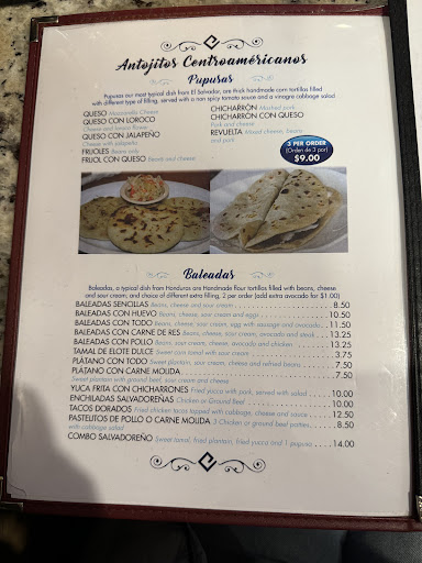 The food was pretty good but my entrĂ©e, the Bistec Salvadoreno was quite salty & I do like my food on the saltier side but it was still a bit much for me. I also got the Combo Salvadoreno as an appetizer which included a bean & cheese pupusa (amazing, highly recommend), yucca fries (very good đ), sautĂ©ed? plantains (good), a sweet corn tamale (pretty good but dry), chili sauce (could have been spicier but had good depth of flavor), thick white sauce (not sure what it was but it was a bit cheesy tasting and very good), & a cabbage slaw with oregano (very fresh & tasty - the earthiness of the oregano balances the tang in an interesting way). I got the Empanadas Salvadorenas Con Leche as a dessert and these were also very good! I also got the 32 Oz hibiscus juice for a drink and I was disappointed that they diluted it with ice and it definitely wasnât as good as other hibiscus Iâve had, possibly as a result of...